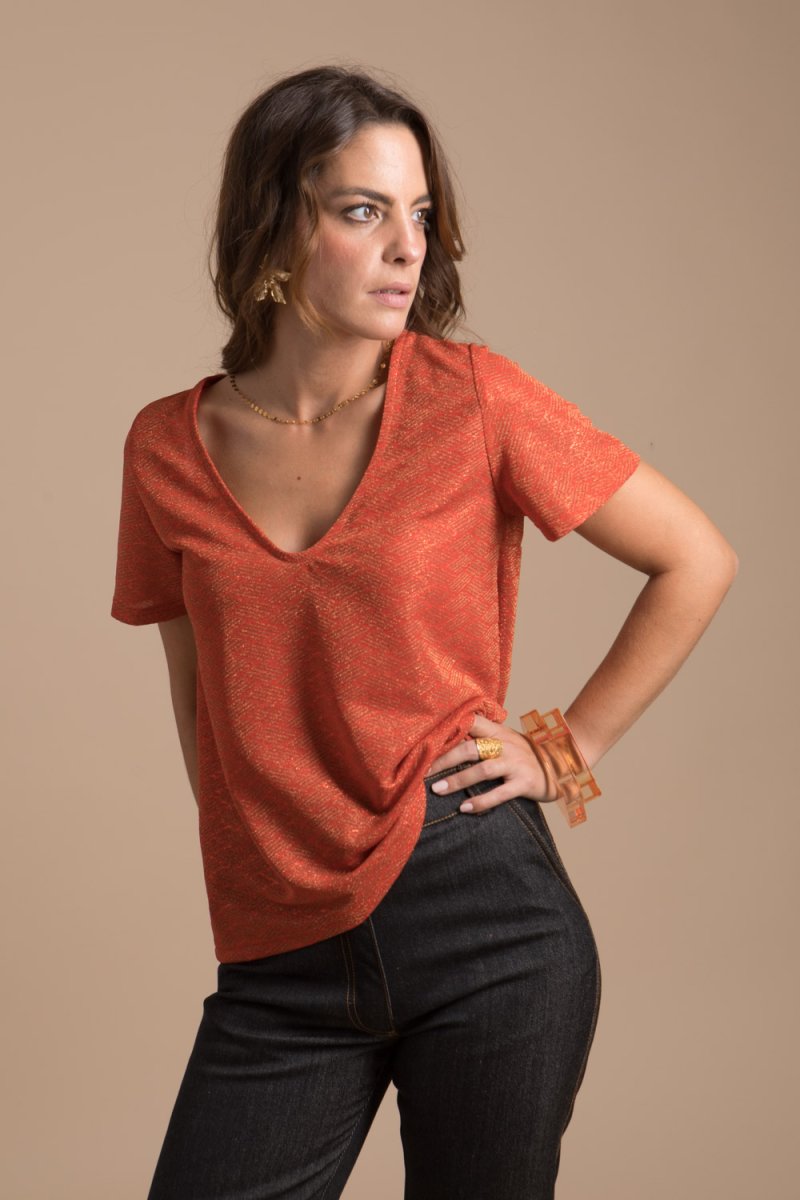 Le top Gaby femme, confectionné dans un beau tissu couleur rouge orangé avec une touche dorée est une pièce tendance qui apporte élégance à vos looks d’automne-hiver. Cette création est fabriquée avec amour au sein de notre atelier à Montpellier, grâce à un savoir-faire artisanal et une qualité Made in France.