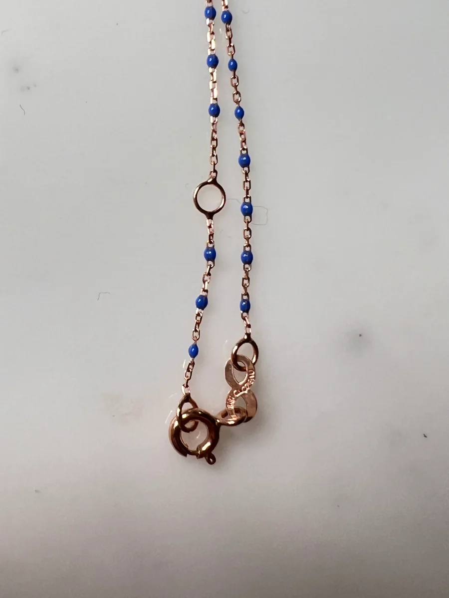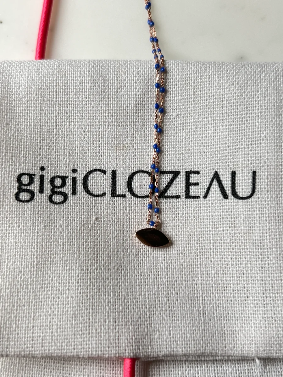 Jamais porté Marque : Gigi clozeau Modèle : Eye Classic Or rose Couleur : Bleu Composition: or 18 carats (750 millièmes) et résine info taille: 42 cm avec anneau intermédiaire à 40 cm Prix d’achat Neuf: 625€