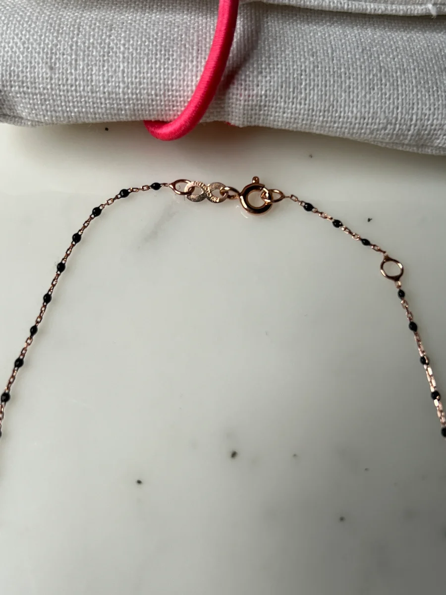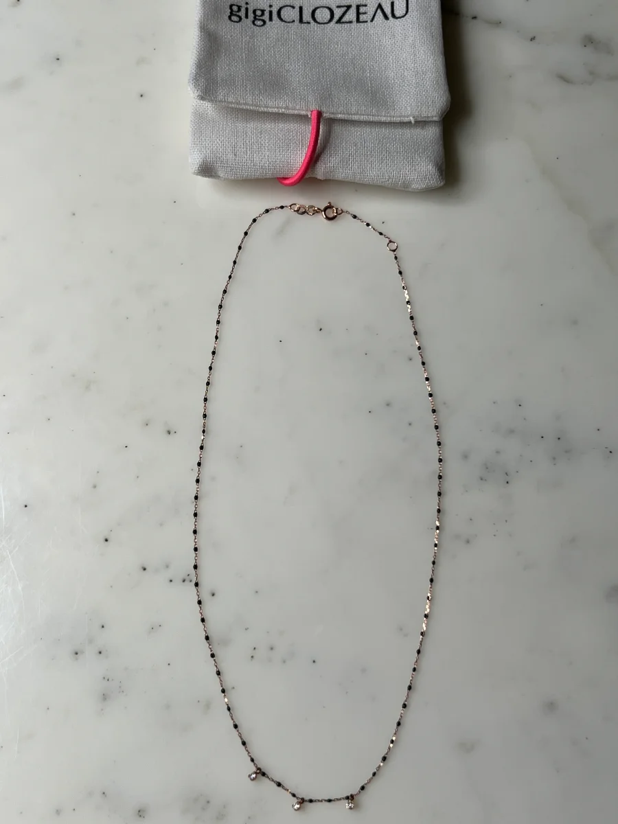 Jamais porté Marque : Gigi clozeau Modèle : mini Or rose Couleur : Résine noire 42 cm avec anneau intermédiaire à 40 cm Composition : Or 18 carats (750 millièmes) et résine. 3 Diamants. Prix d’achat Neuf: 1030€