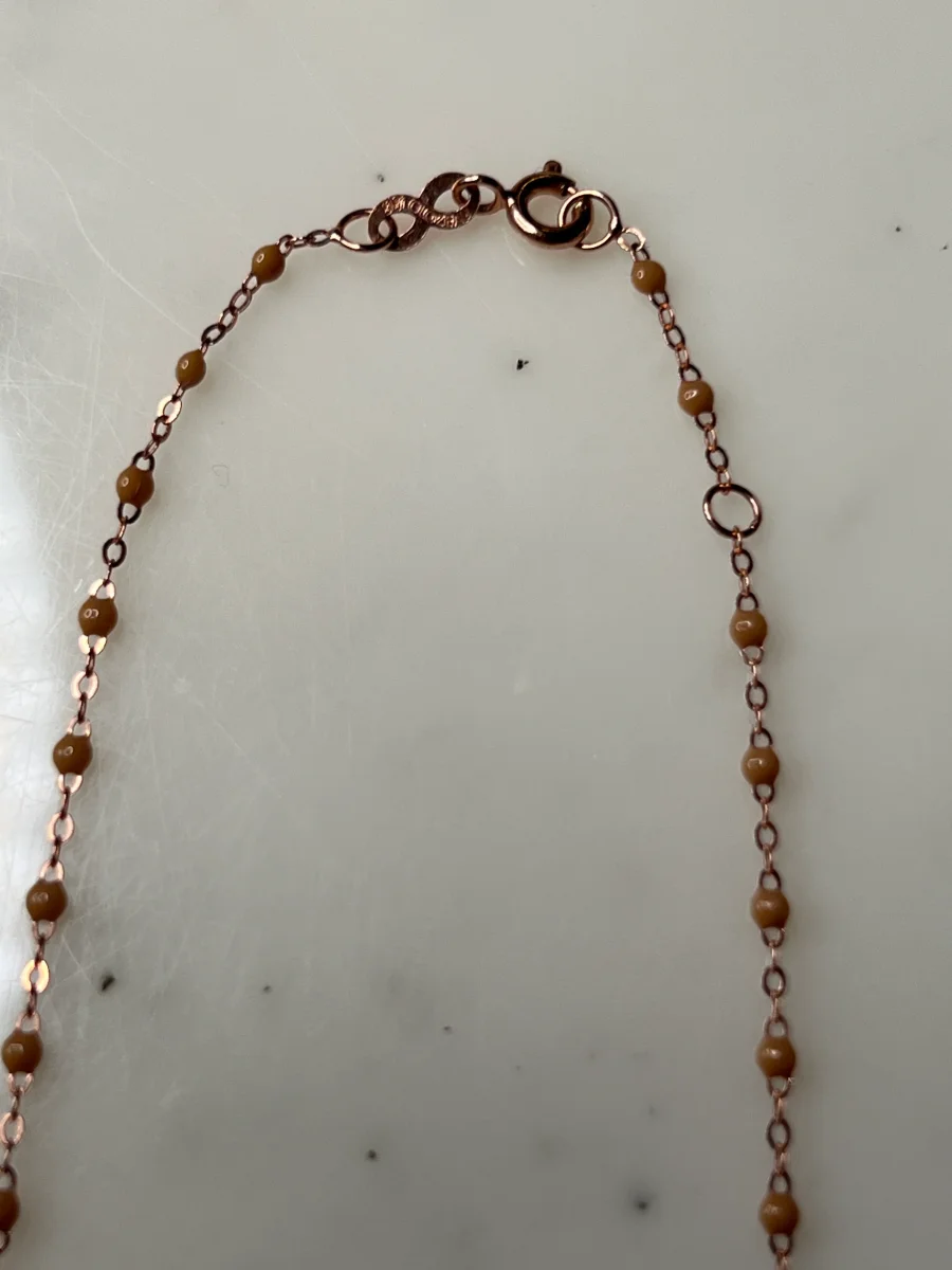 Jamais porté Marque : Gigi clozeau Modèle : Classique Or rose Couleur : Nude clair composition: Or 18 carats (750 millièmes) et résine info taille: 42 cm avec anneau intermédiaire à 40 cm Prix d’achat Neuf: 395€