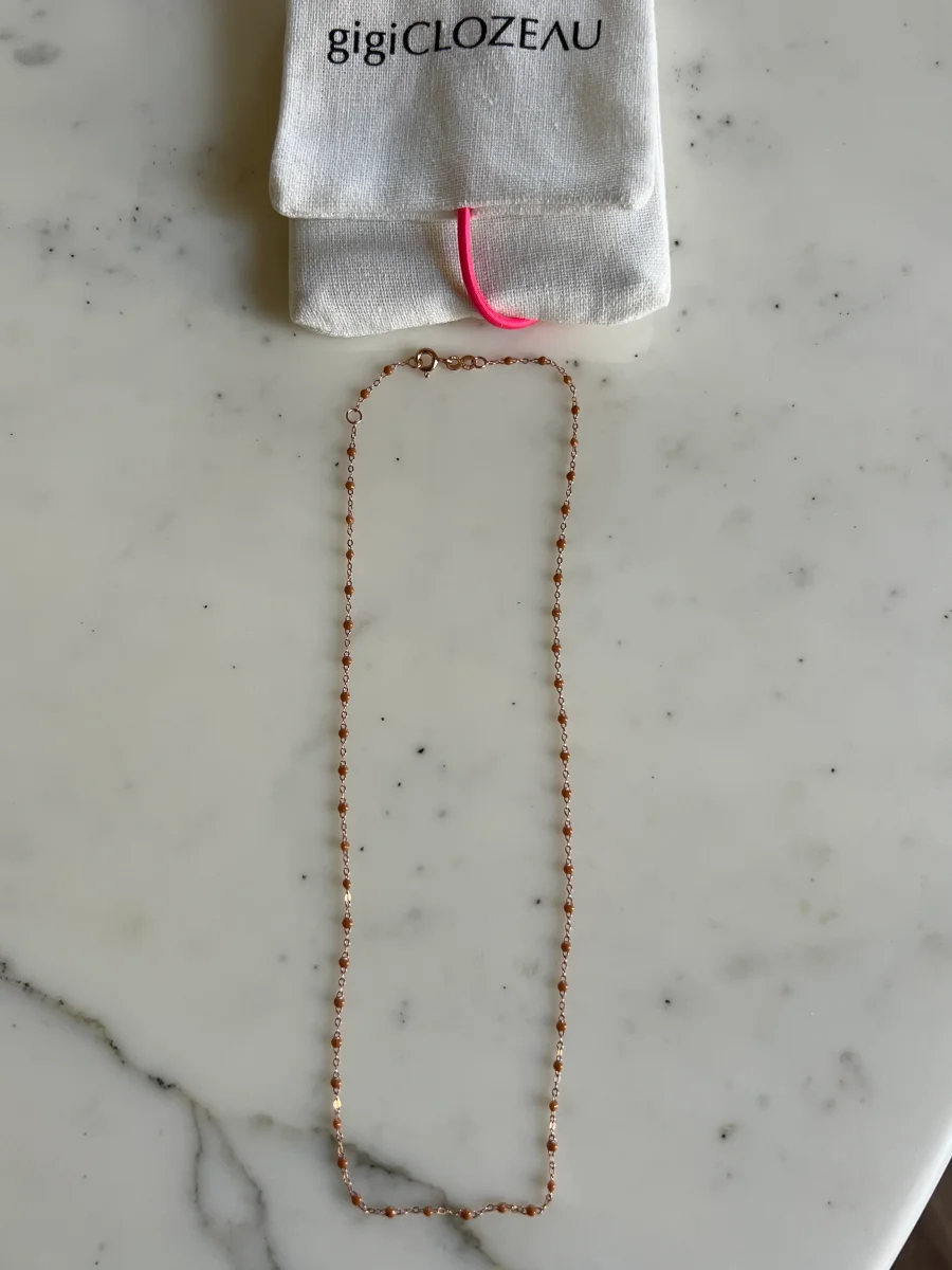 Jamais porté Marque : Gigi clozeau Modèle : Classique Or rose Couleur : Nude foncé composition: Or 18 carats (750 millièmes) et résine info taille: 42 cm avec anneau intermédiaire à 40 cm Prix d’achat Neuf: 395€