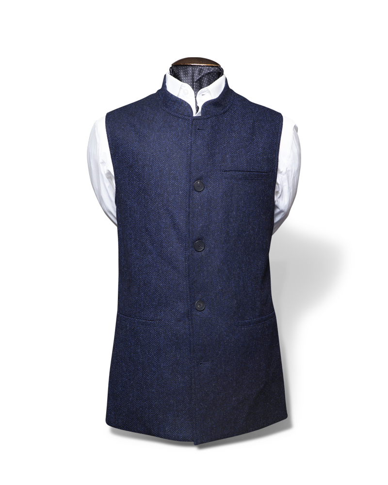 Le gilet de tweed en laine bleu est entièrement tissé à l’aide de fils aux motifs chevronnés.