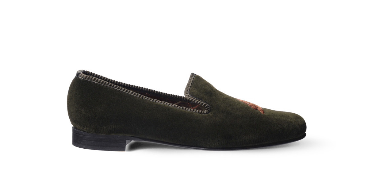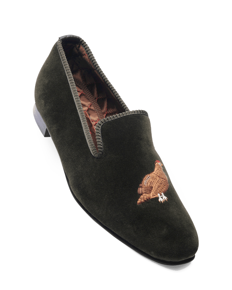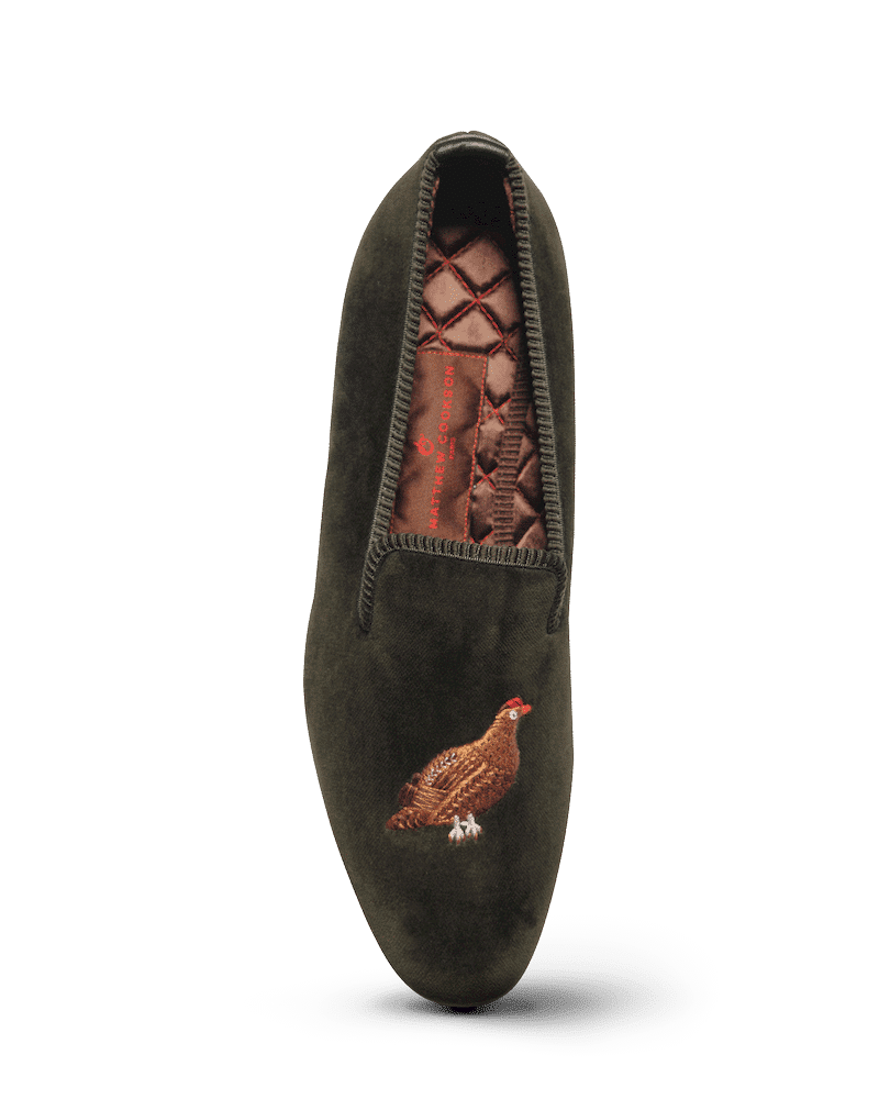 Les slippers grouse Matthew Cookson sont faites en velours de coton et brodées à la main, la doublure est en satin matelassé, le tout monté sur une fine semelle en cuir. Le summum de l’élégance et du confort.