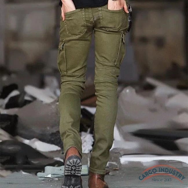 Trouvez le côté pratique du pantalon cargo mince avec un style à la mode ! Idéal pour les sorties à moto, ce jean est réalisé avec une qualité irréprochable. Des caractéristiques uniques, telle sa coupe slim et sa couleur verte, font de ce vêtement un produit de grande valeur. Vous le combinerez facilement avec tous vos autres habits.