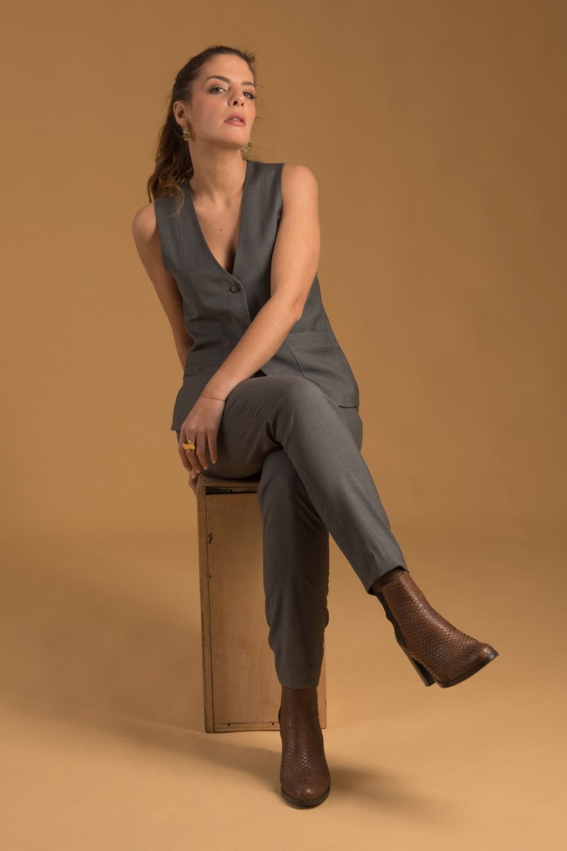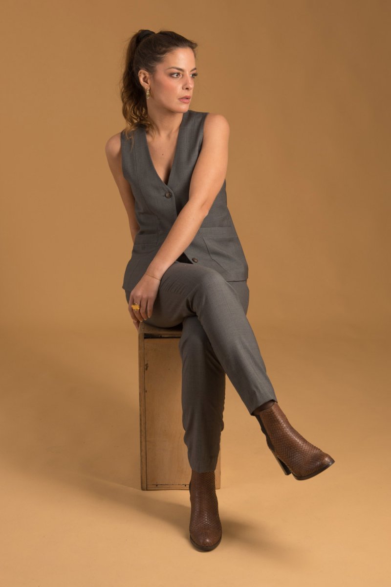 Ce joli gilet gris pour femme, signé Danielle Engel, est confectionné dans un tissu 100% français. Cette création est fabriquée en France dans notre atelier à Montpellier.