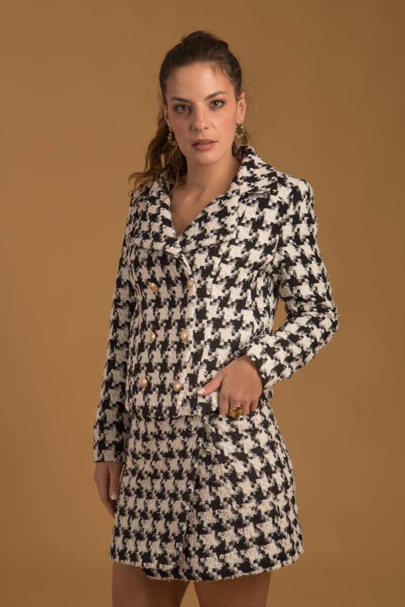Pour un look harmonieux, associez-la avec la veste imprimée pied-de-coq.