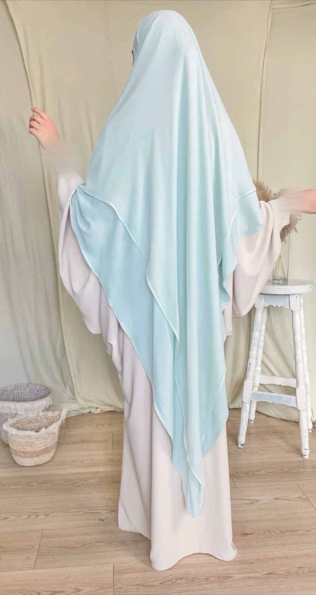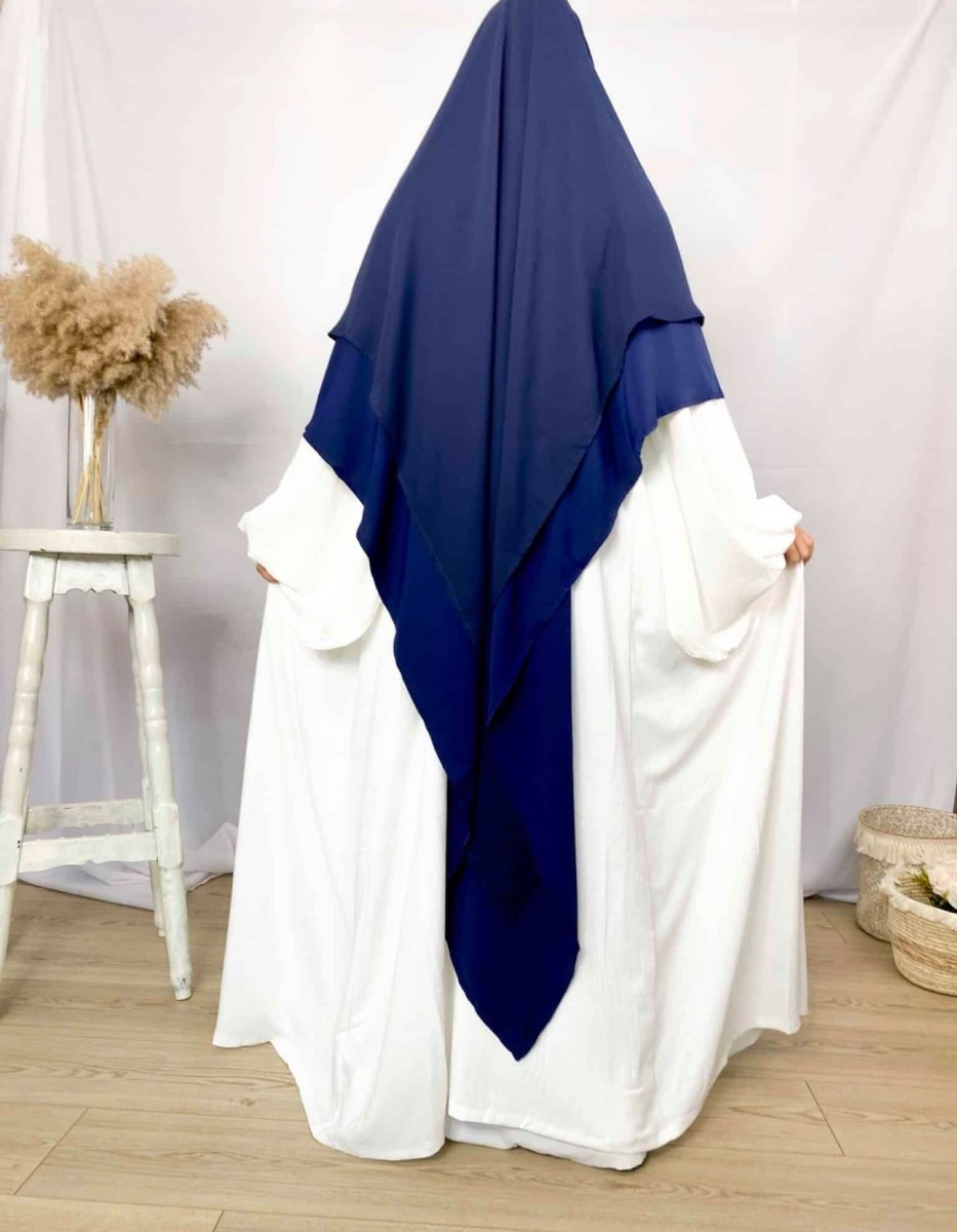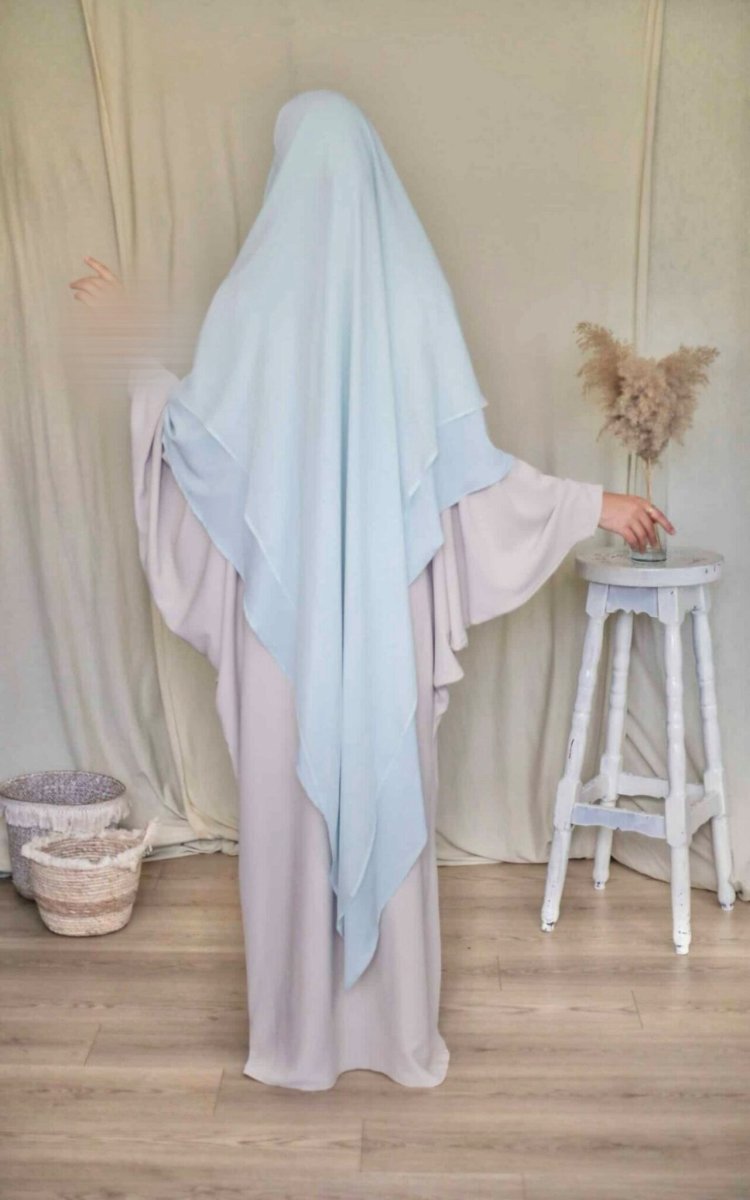 Voici le Khimar Sitar Long 2 voiles Duo. En effet , c’est un Khimar duo car il se compose de 2 voiles différents un premier en Soie de Médine et un second en mousseline. C’est l’idéal pour les périodes estivales. C’est un Khimar qui se noue très facilement à l’arrière comme un Jilbab. Le Khimar reste bien en place et vous pouvez ainsi l’ajuster selon vos envies.