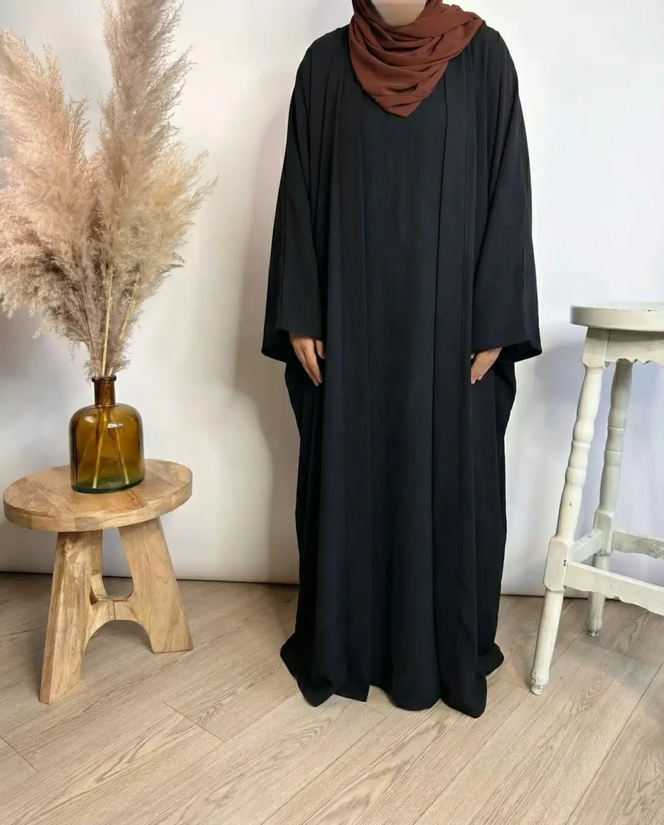 Le Kimono Farasha se marie parfaitement avec une sous-abaya noire ou dans les tons beige. Vous pouvez également le porter avec un hijab ou un khimar pour un look plus sobre.