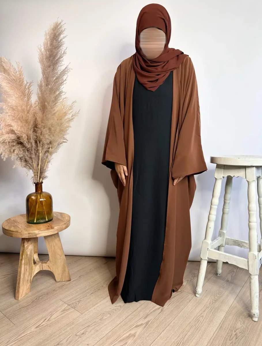 Taille unique allant du S au 4XL (36 au 48) Caractéristiques: Matière: Soie de médine Couleur: Noisette Manches: Longues et larges, avec papillons Farasha Longueur: 1m45 Parfait pour: Le printemps-été, à porter avec une abaya, un hijab ou un khimar