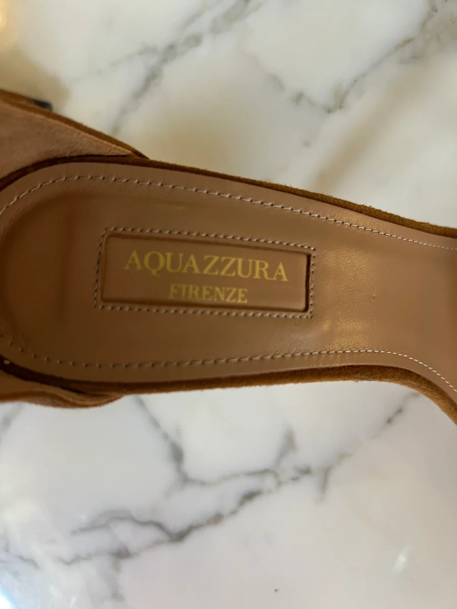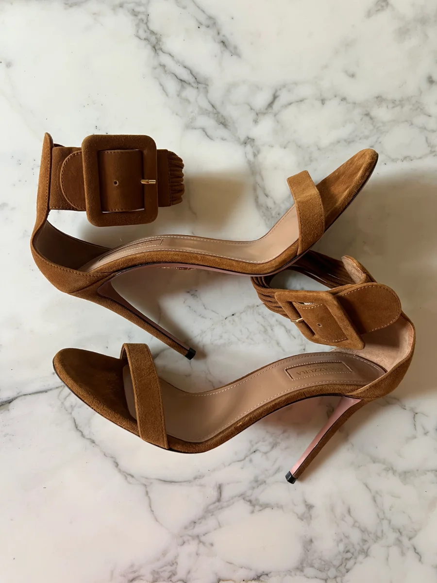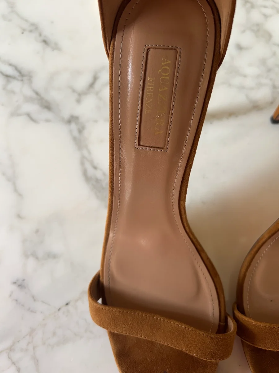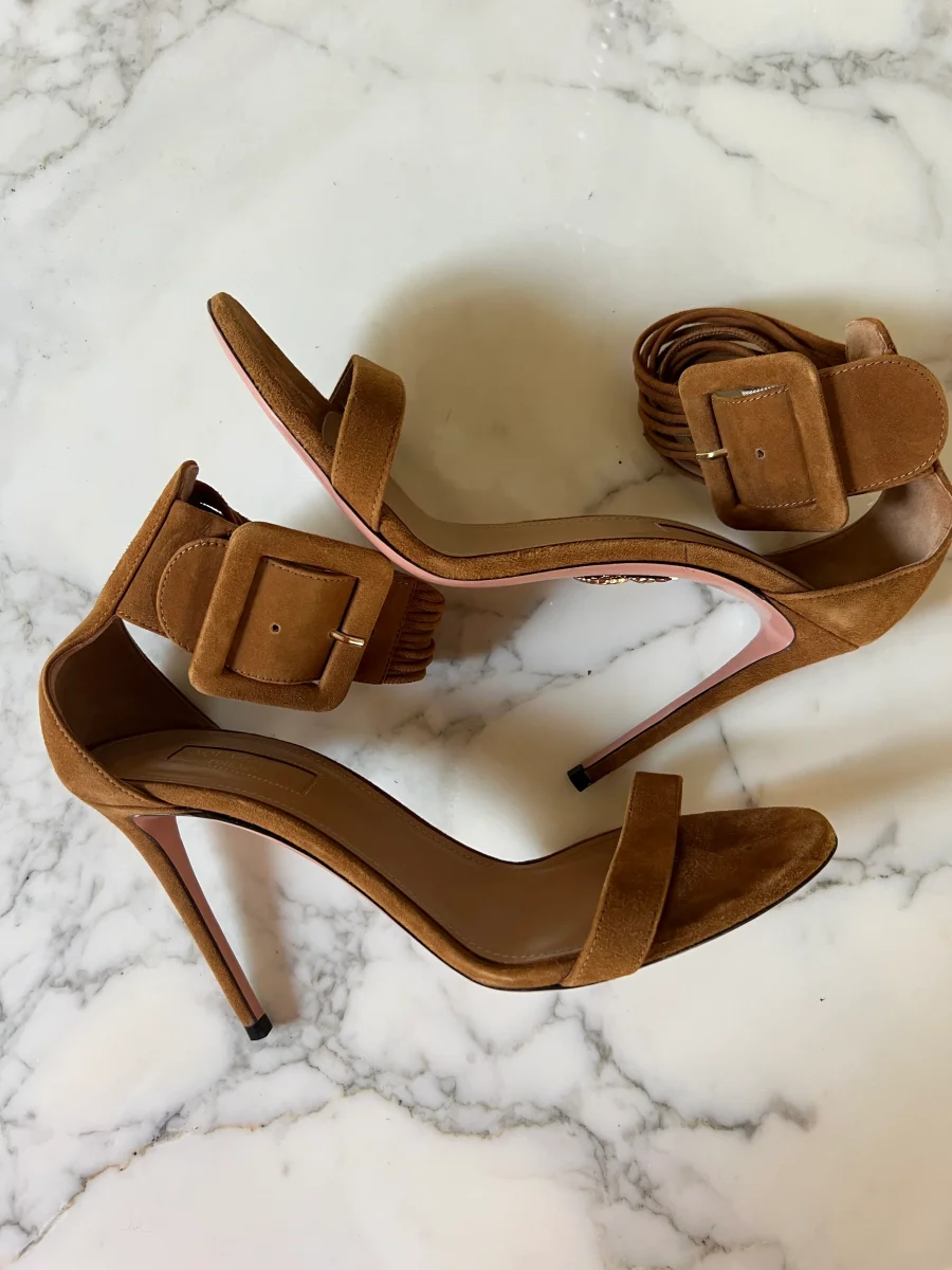 Lucie Gabossi – Aquazzura Sandales talon daim camel boucles Pointure 39