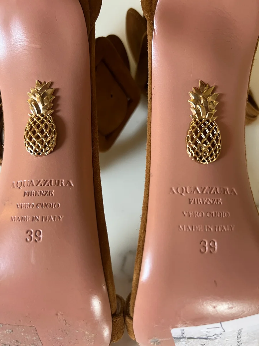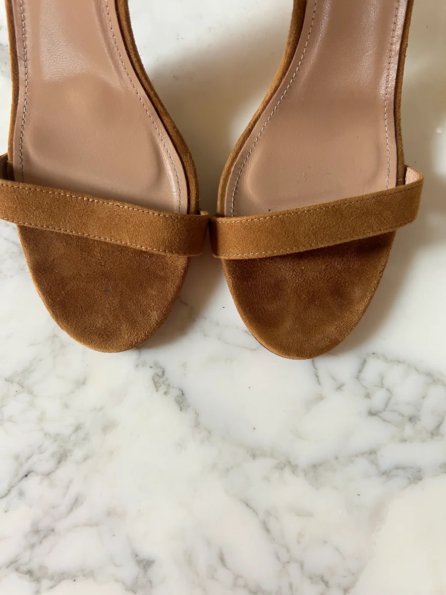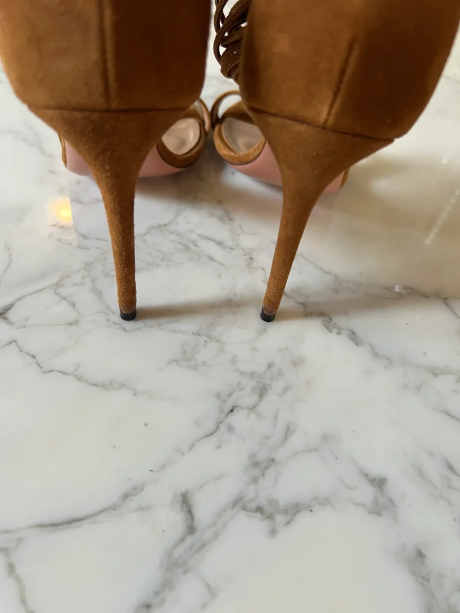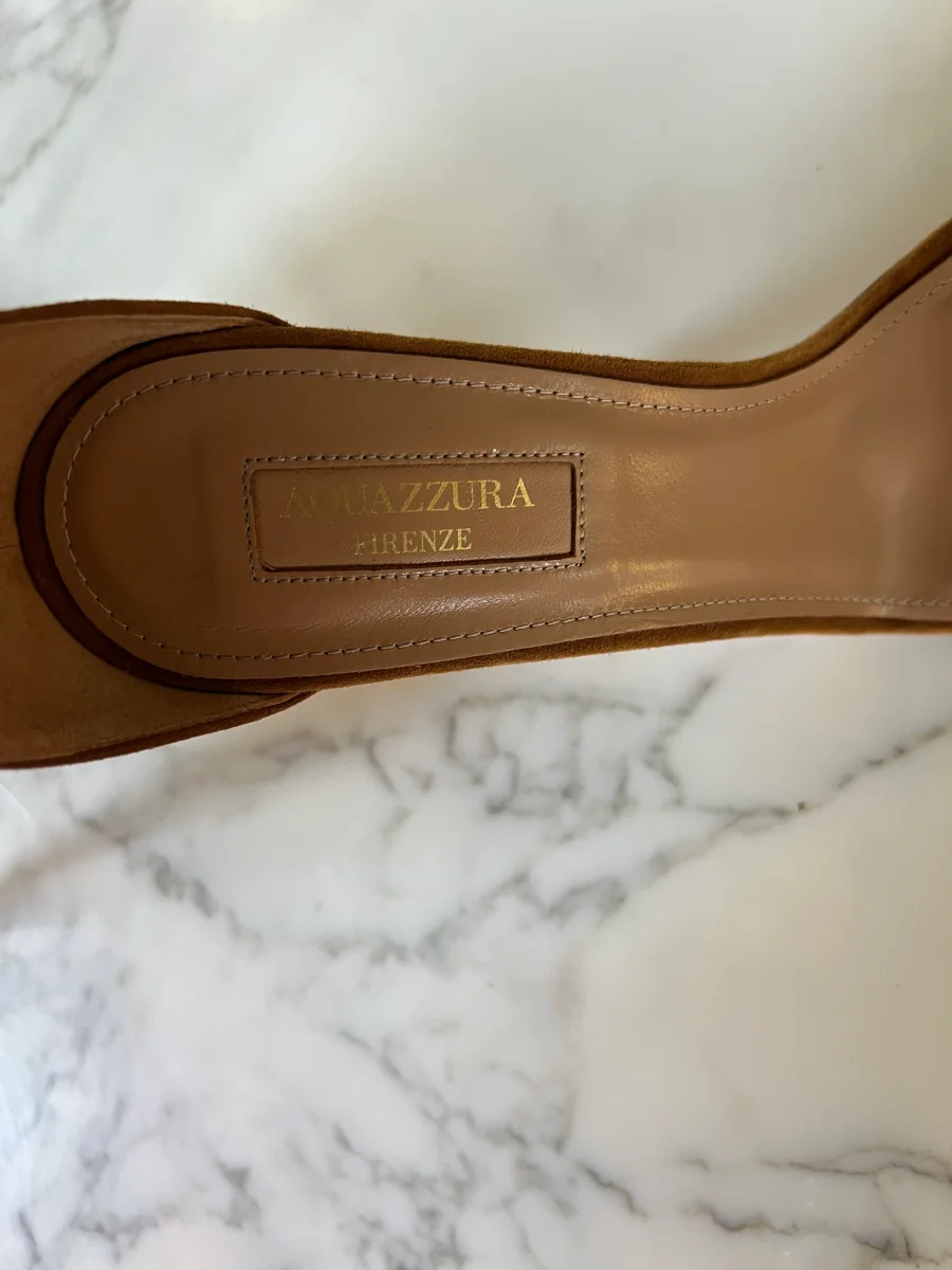 Lucie Gabossi – Aquazzura Sandales talon daim camel boucles Pointure 39