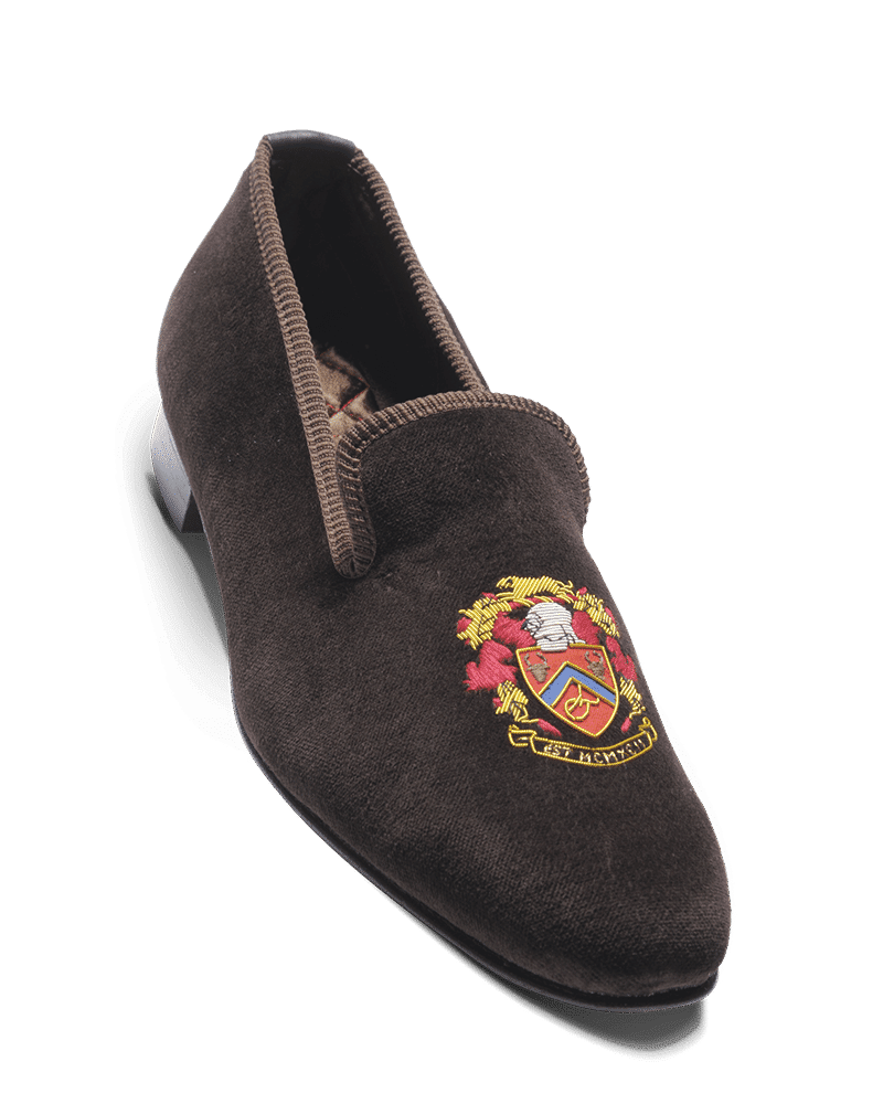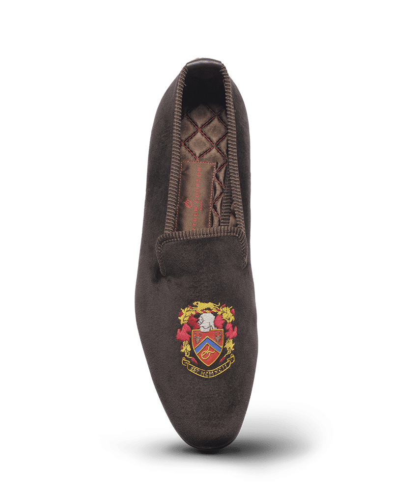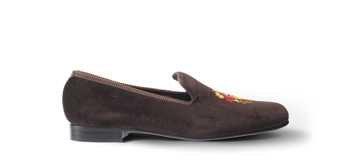 Les slippers MC blason Matthew Cookson sont faites en velours de coton et brodées à la main, la doublure est en satin matelassé, le tout monté sur une fine semelle en cuir. Le summum de l’élégance et du confort.