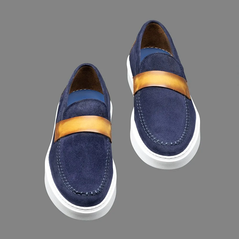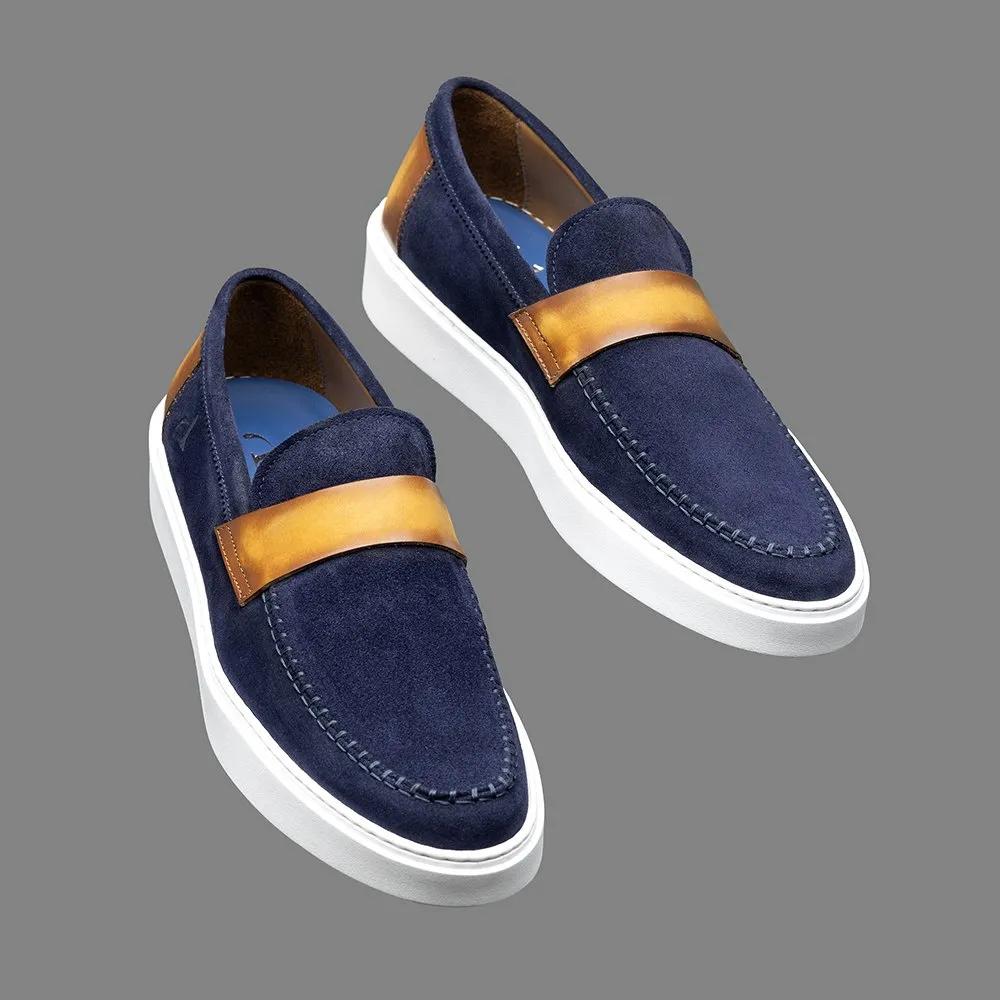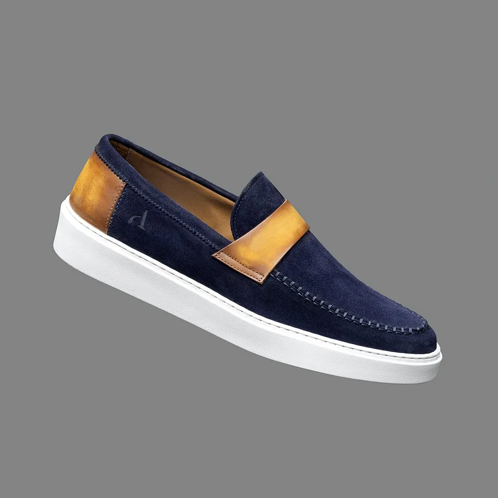 Découvrez le tout nouveau mocassin Altan Bottier en cuir de veau velours bleu marine et strap en cuir de veau lisse gold, monté sur une semelle gomme blanche pour un confort parfait. Existe aussi en veau velours Cognac et strap en cuir lisse bleu marine.