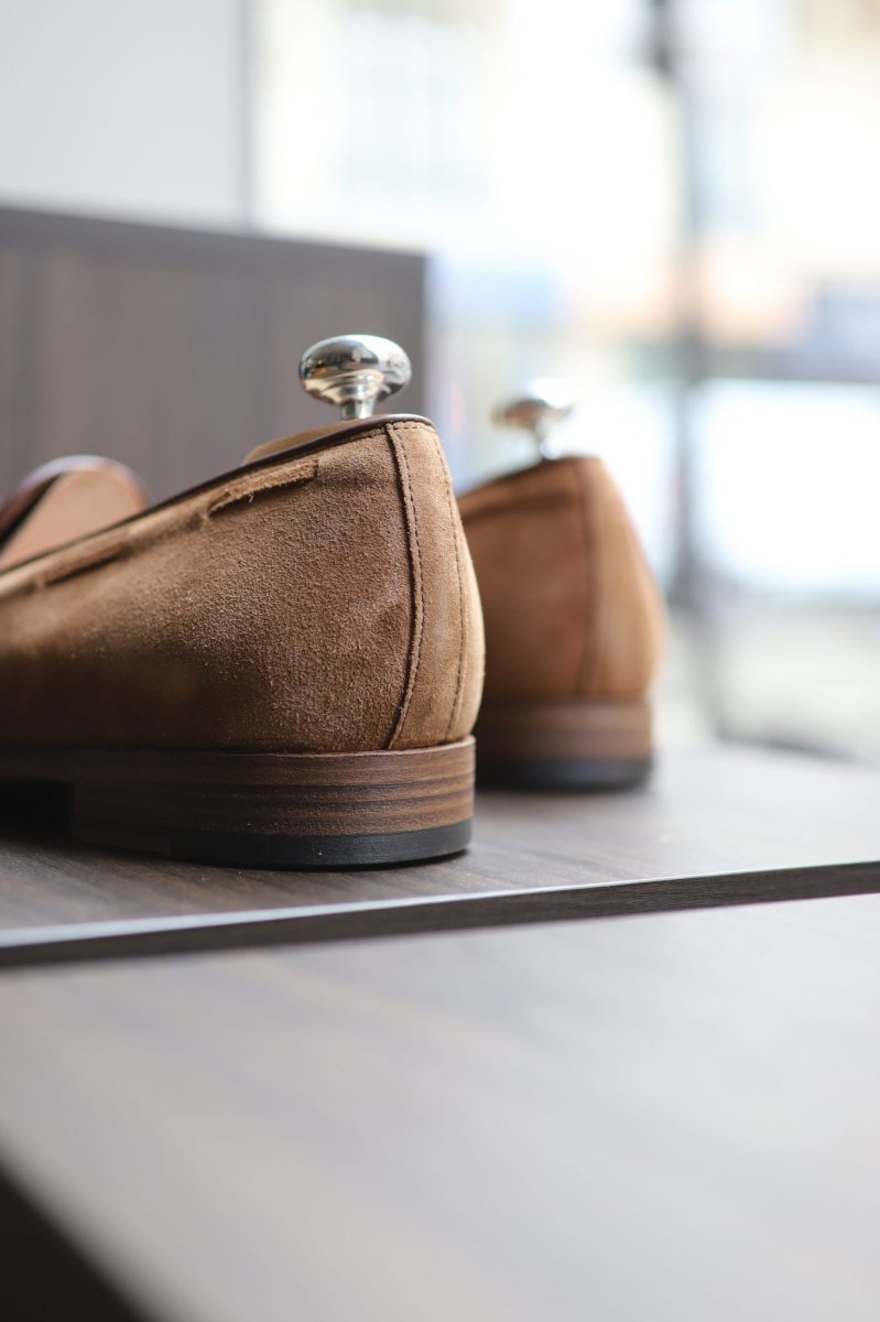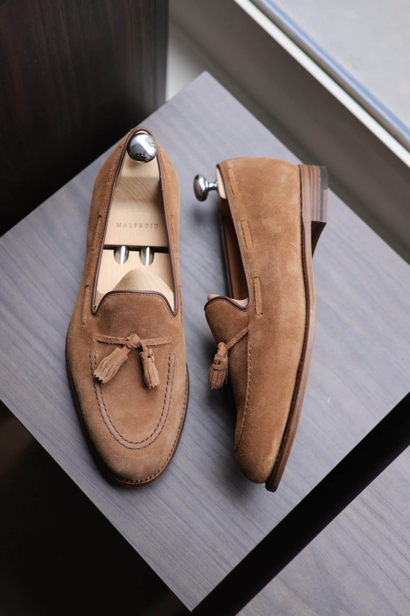 Enfant prodige de la famille nombreuse des loafers (bit, penny, driving…), voici le notre nouveau tassel loafer (mocassin à pampilles) Malfroid dans une version velours camel pour le printemps été 2025.