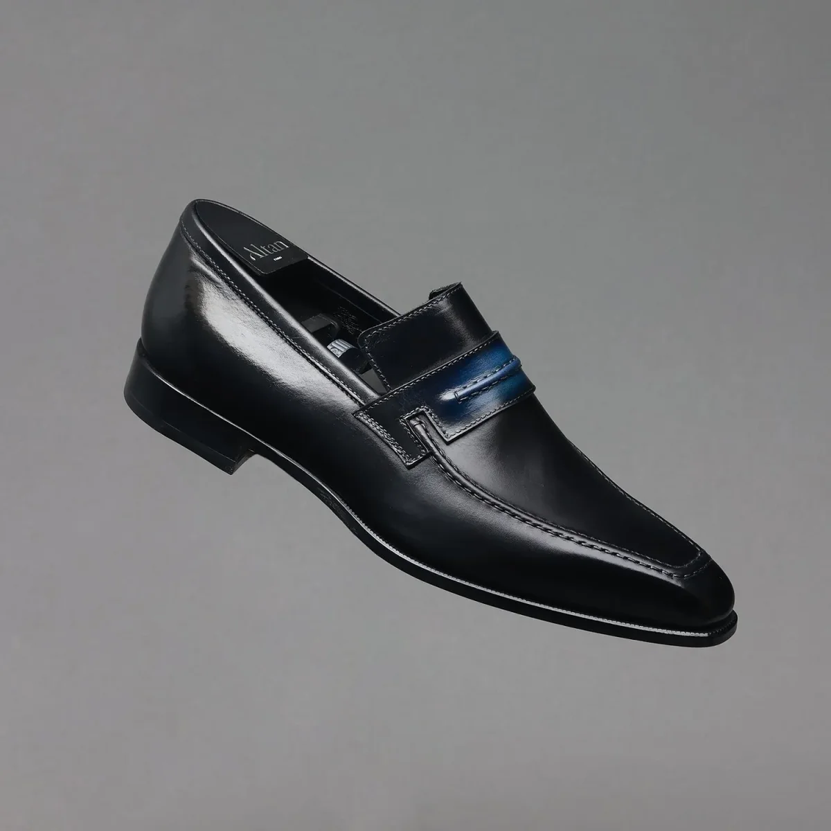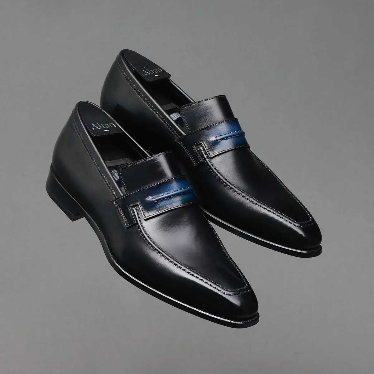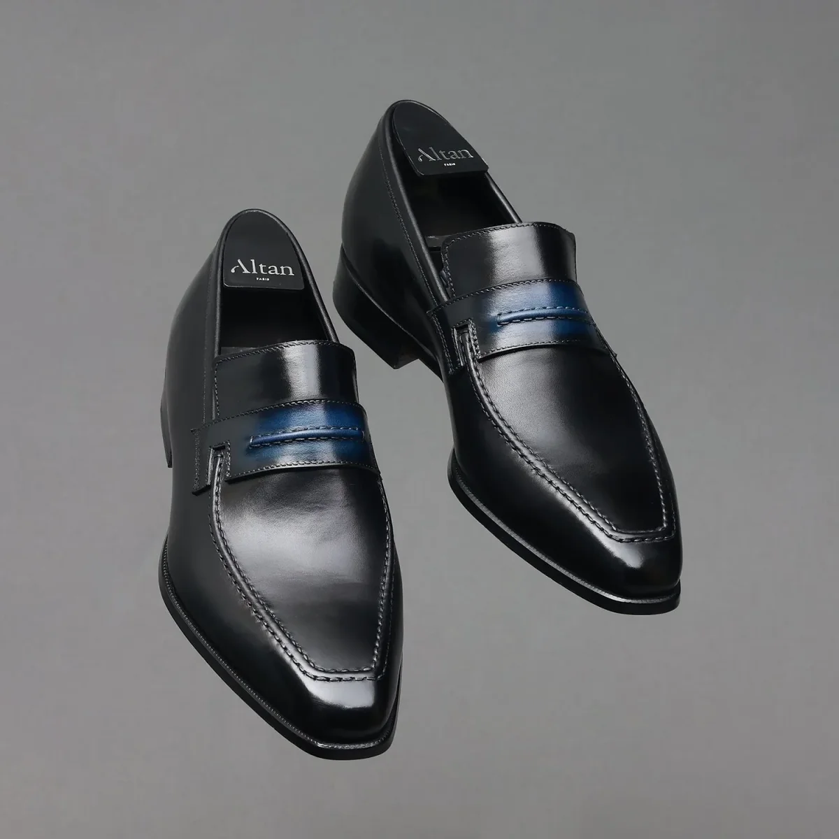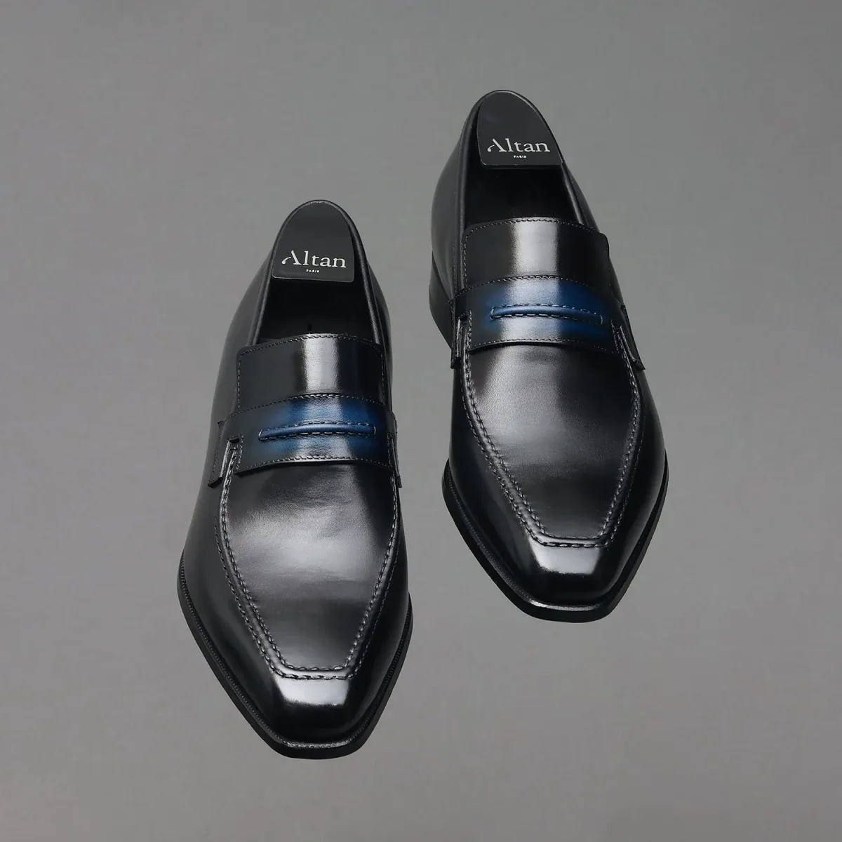 Le mocassin Le Lincoln est l’une de nos créations emblématiques. Sa ligne élancée et son strap cousu sur le plateau lui confèrent une élégance à la fois contemporaine et intemporelle. Réalisé en montage Blake et patiné à la main dans notre atelier parisien, ce modèle se décline en cuir de veau, python ou crocodile. Grâce à notre service de patines personnalisées, Le Lincoln offre une expression unique du style et du savoir-faire Altan Bottier. Ici dans une version en cuir noir et strap bleu nuit.