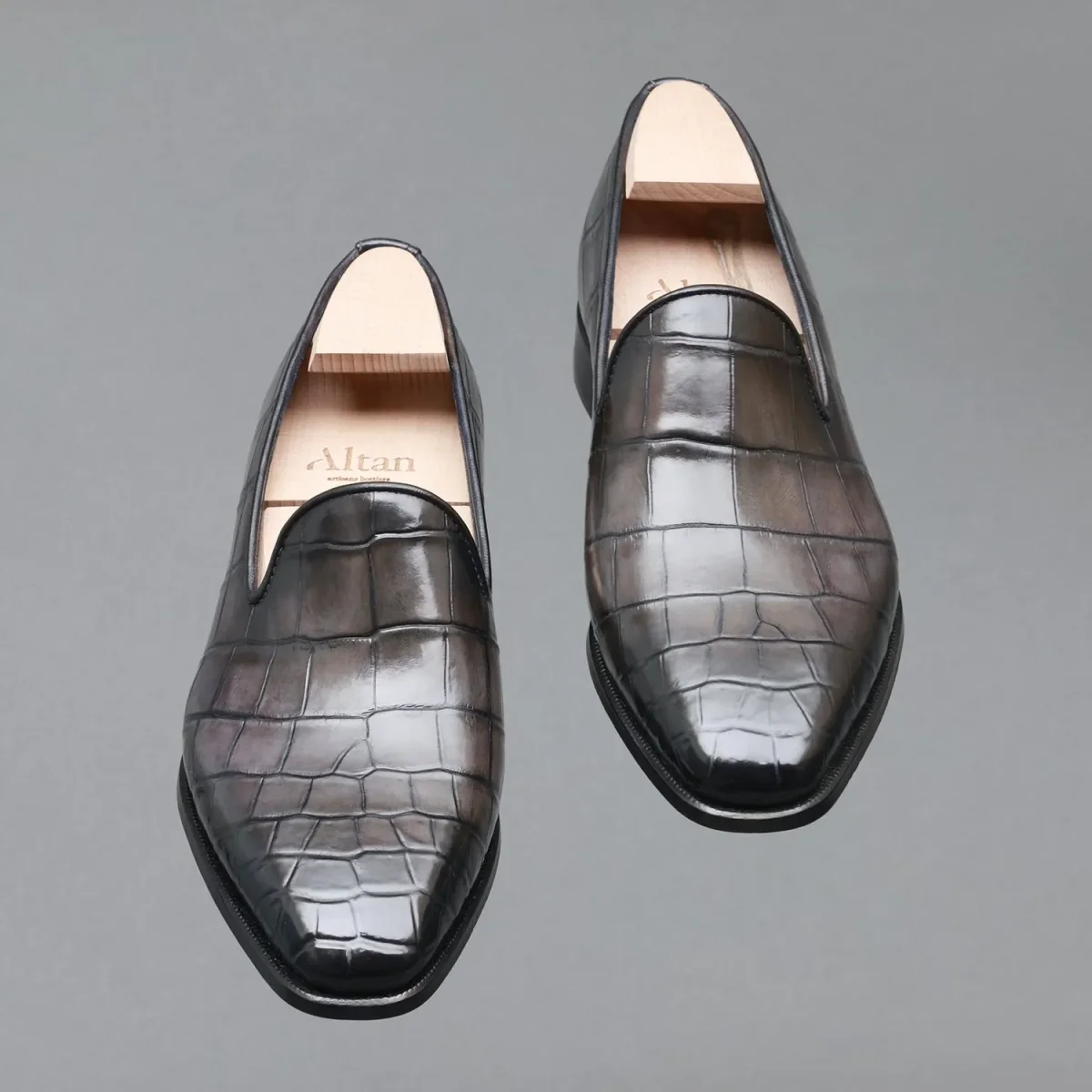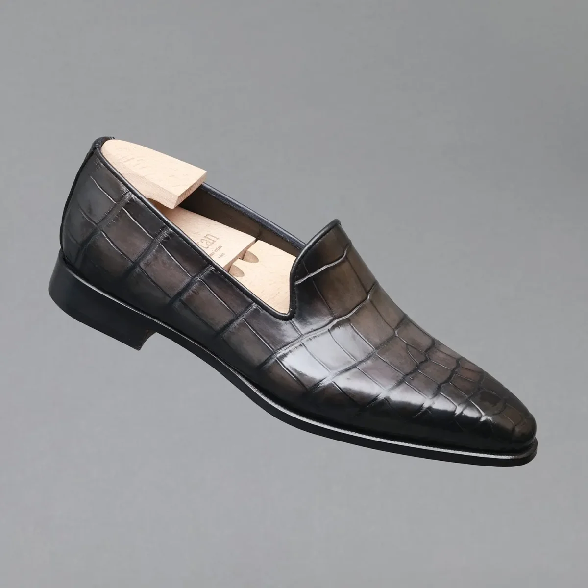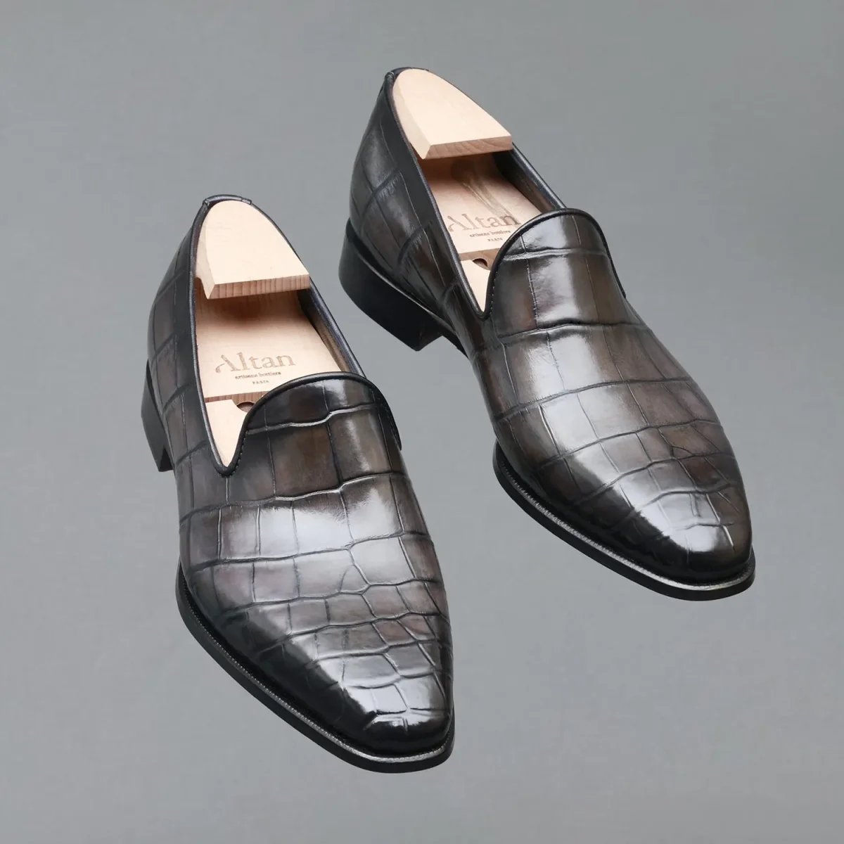 Ce mocassin est réalisé en une seule pièce de cuir d’Alligator. S’inspirant des formes de l’Albert Slipper ce mocassin très « casual » dans l’esprit n’en reste pas moins un véritable soulier à la construction traditionnelle à bout dure et montage blake sous gravure. C’est un mocassin finalement quasi toute saison. Présenté ici dans une peausserie de crocodile patinée Gris Brun.