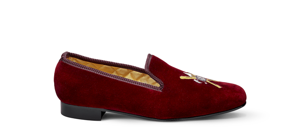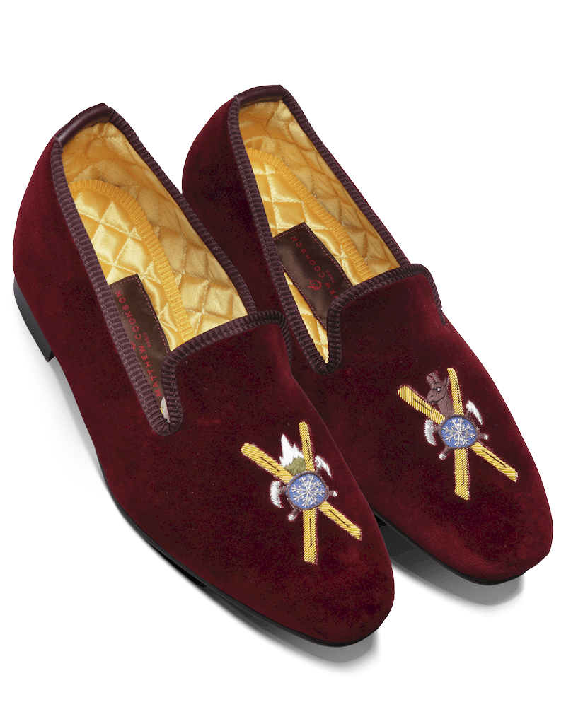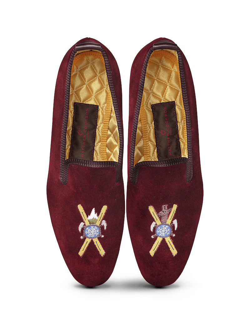 Les slippers montagne Matthew Cookson sont faites en velours de coton et brodées à la main, la doublure est en satin matelassé, le tout monté sur une fine semelle en cuir. Le summum de l’élégance et du confort.