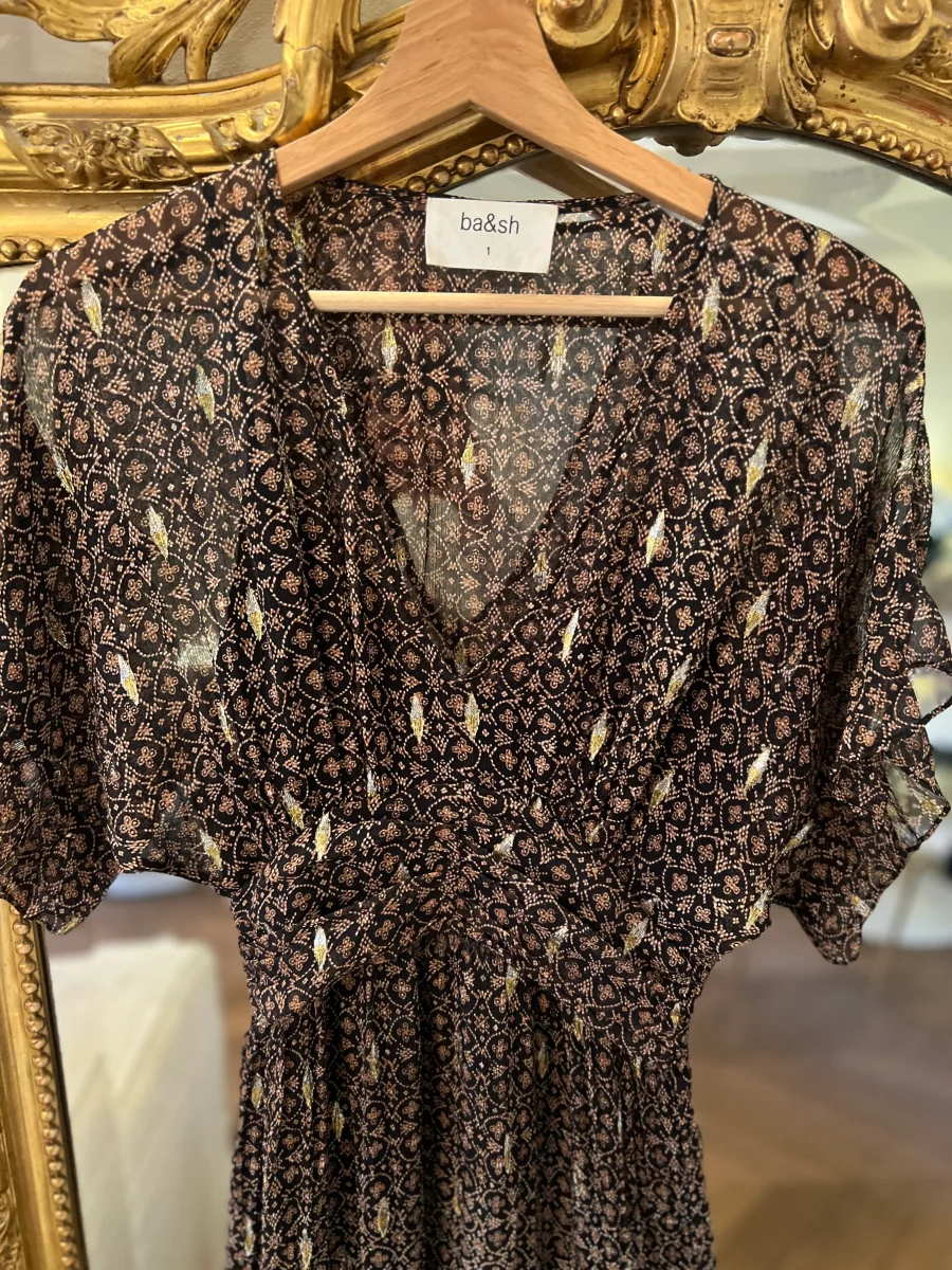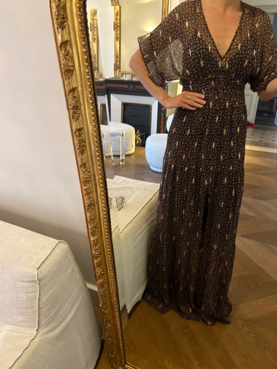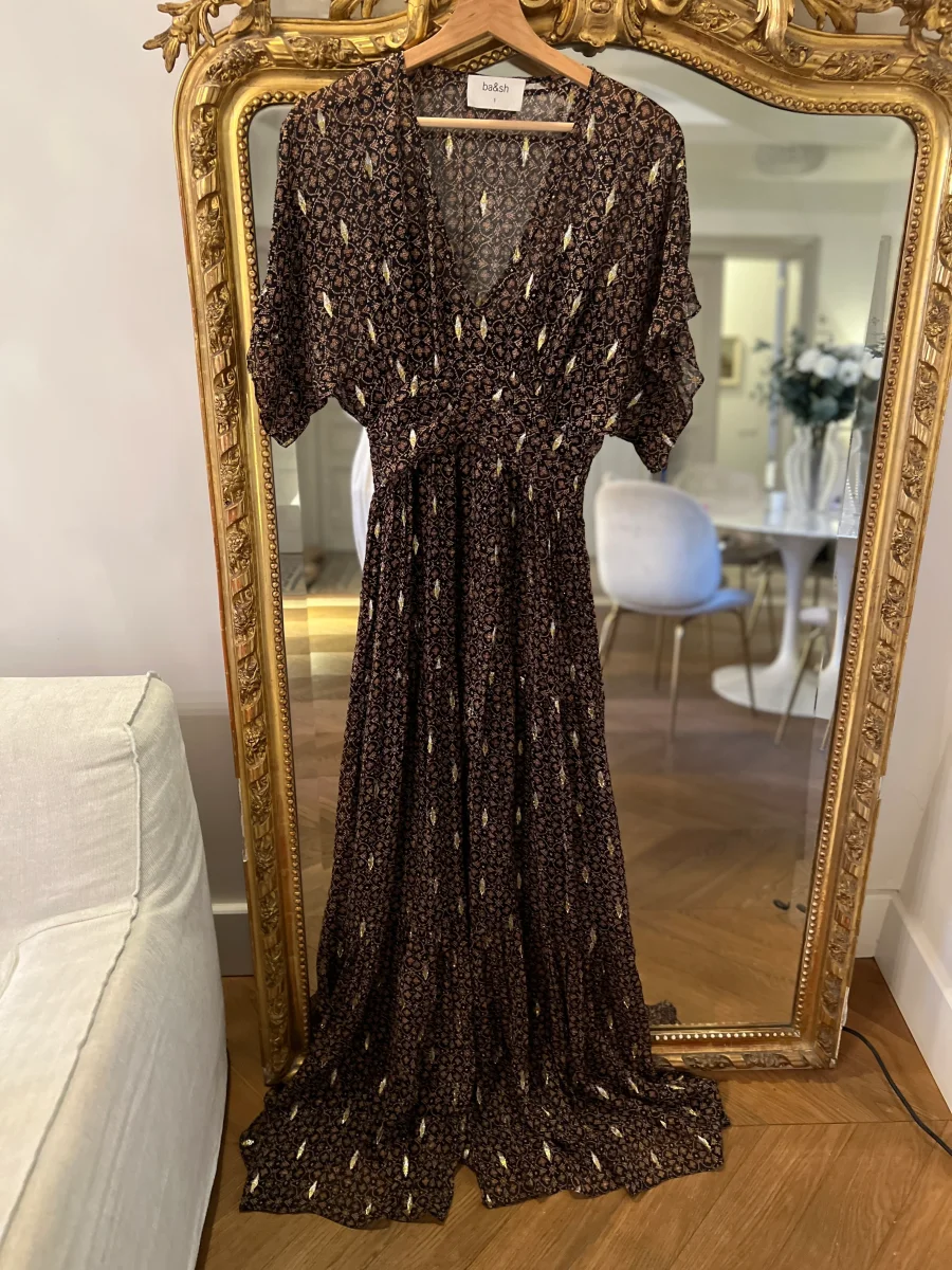 Très bon état (Fente légèrement « décousue » cf.photos mais ne se voit pas une fois la robe portée) Marque : Ba&sh Taille 1 Soie et Fibre metal Pour la longueur je mesure 1m71 Prix d’achat estimé neuf 385€
