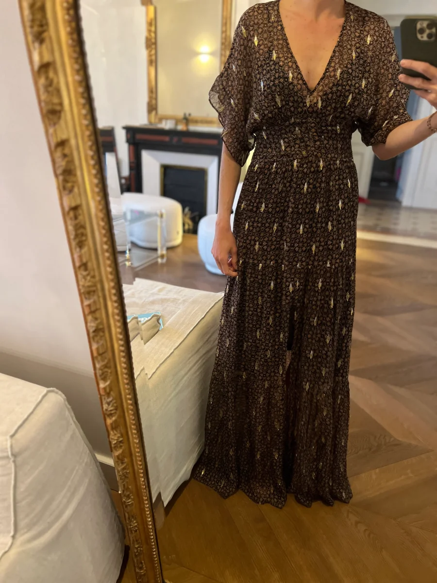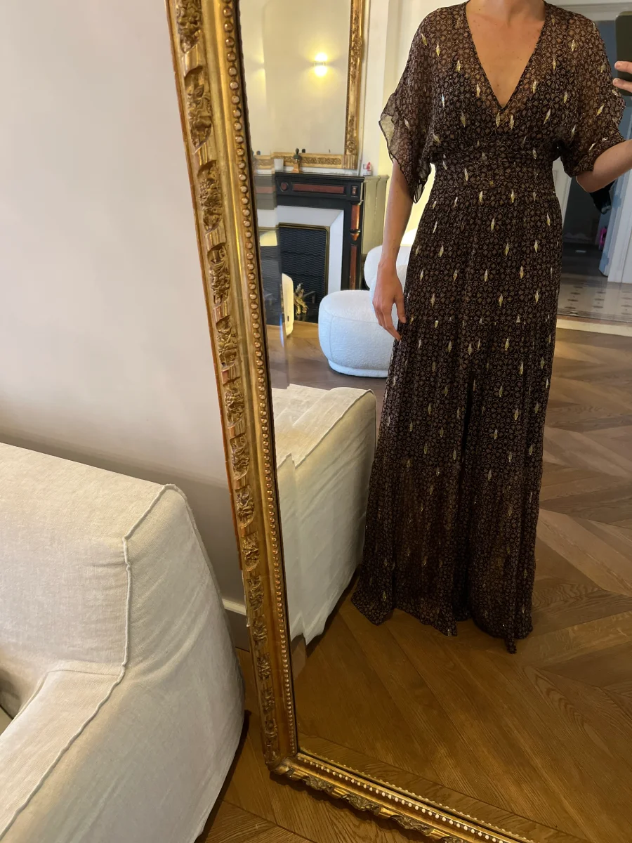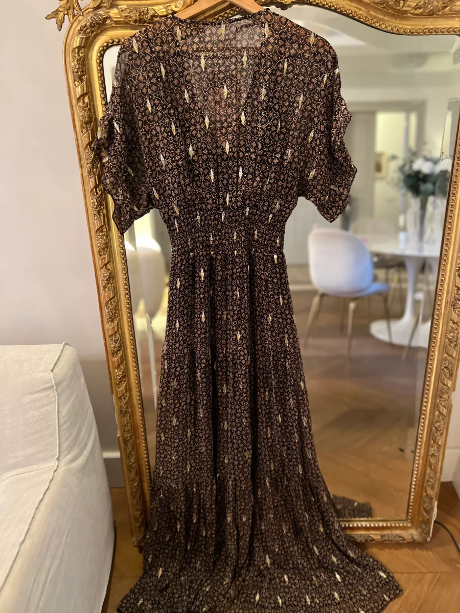 Très bon état (Fente légèrement « décousue » cf.photos mais ne se voit pas une fois la robe portée) Marque : Ba&sh Taille 1 Soie et Fibre metal Pour la longueur je mesure 1m71 Prix d’achat estimé neuf 385€
