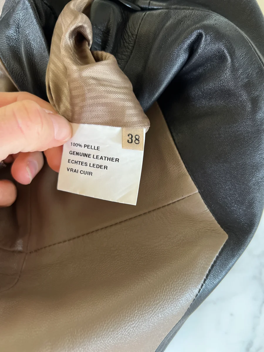 Très bon état seulement étiquettes marque absentes Taille 38 (mais correspond à une taille 36) 100% cuir Pour la longueur je mesure 1m71 Prix d’achat estimé neuf 145€