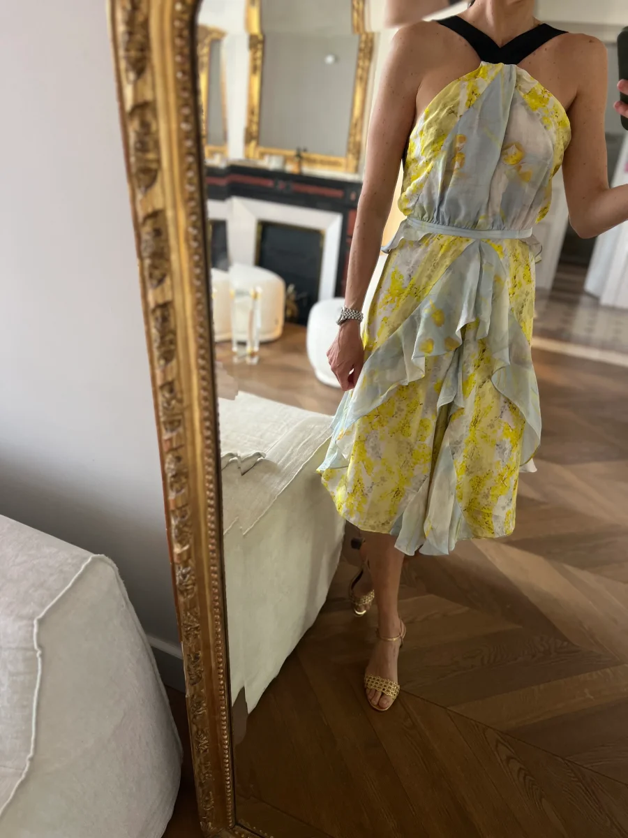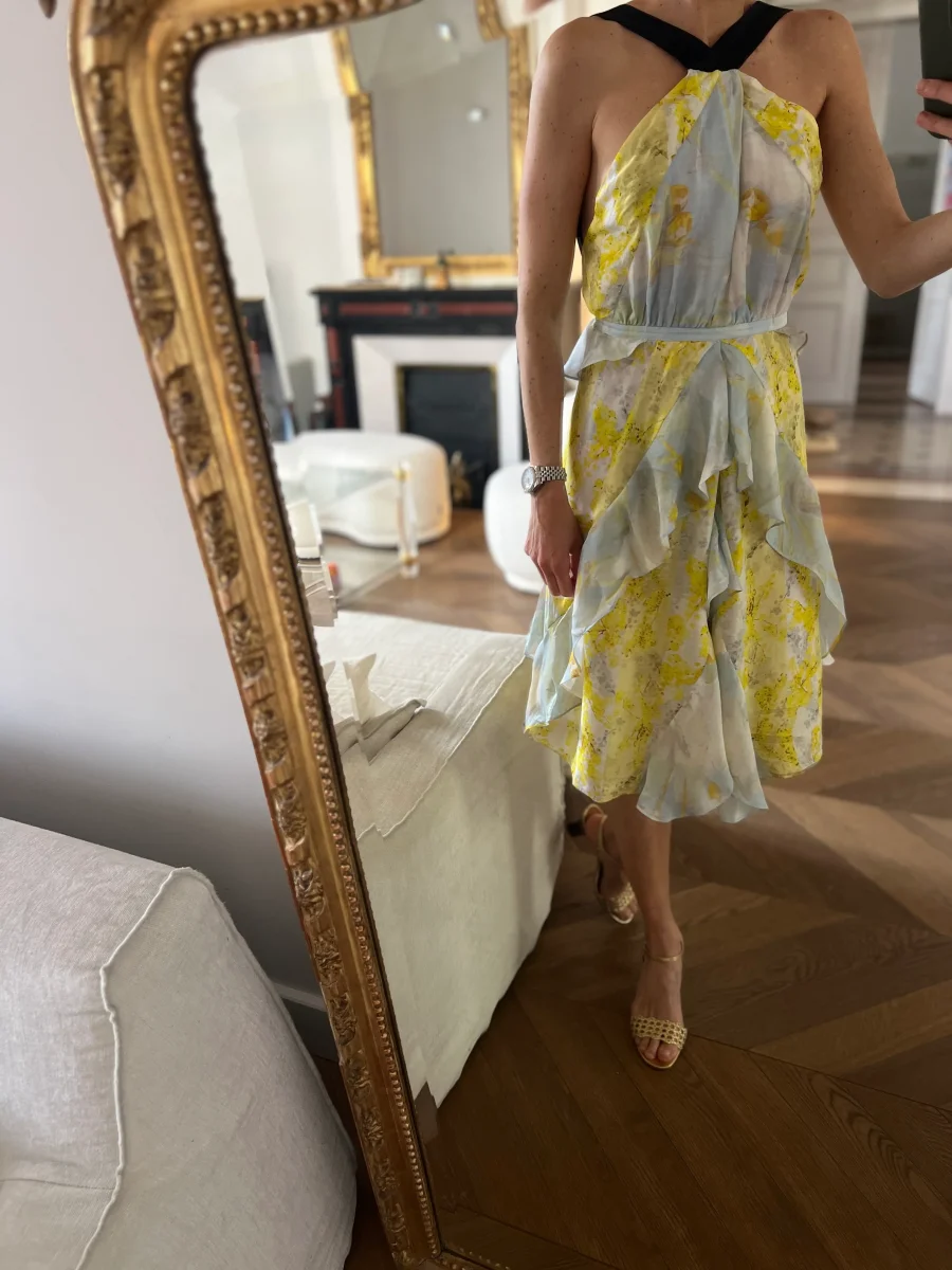 Très bon état (micro tirettes mais ne se voient pas du tout une fois la robe portée cf.photos) Marque : H&M Conscious Exclusive Taille 36 100% soie Pour la longueur je mesure 1m71 Prix d’achat estimé neuf 149€