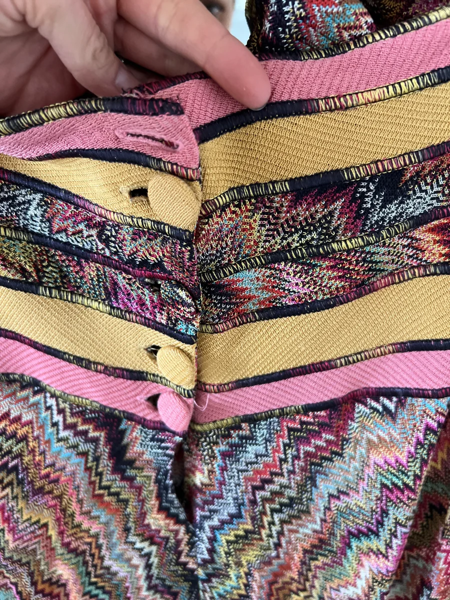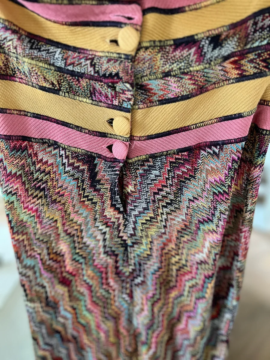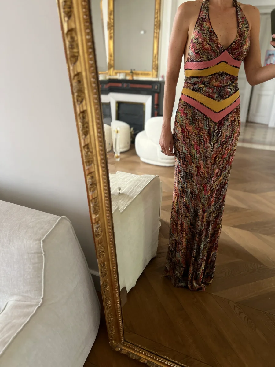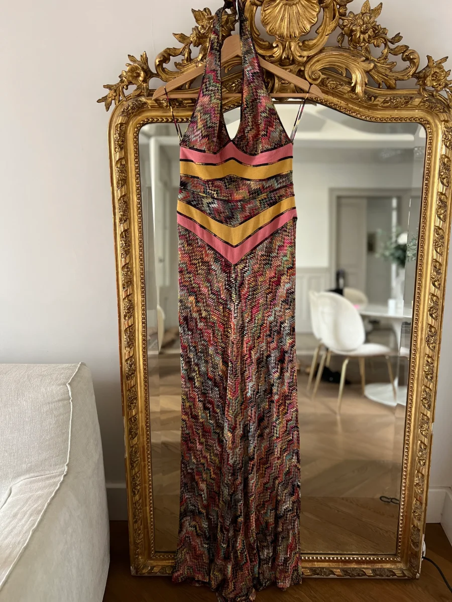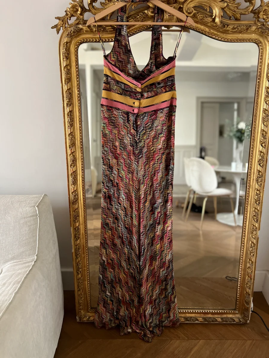 Très bon état général (un bouton manquant à l’arrière) Marque : Missoni Taille 40 (correspond à une taille 36) Rayon et Viscose Pour la longueur je mesure 1m71 Prix d’achat estimé neuf 1050€