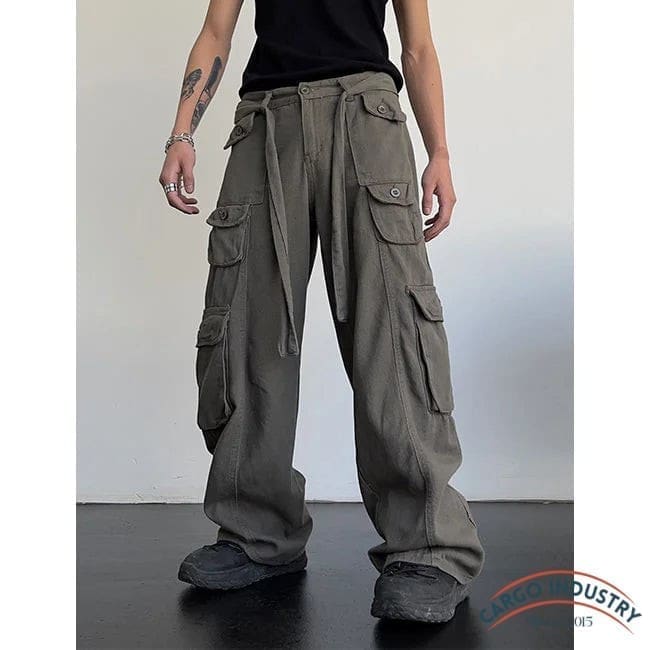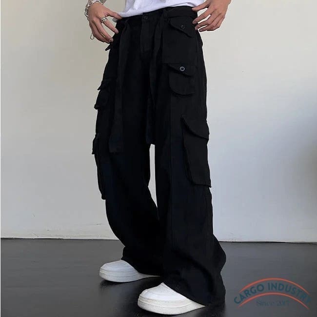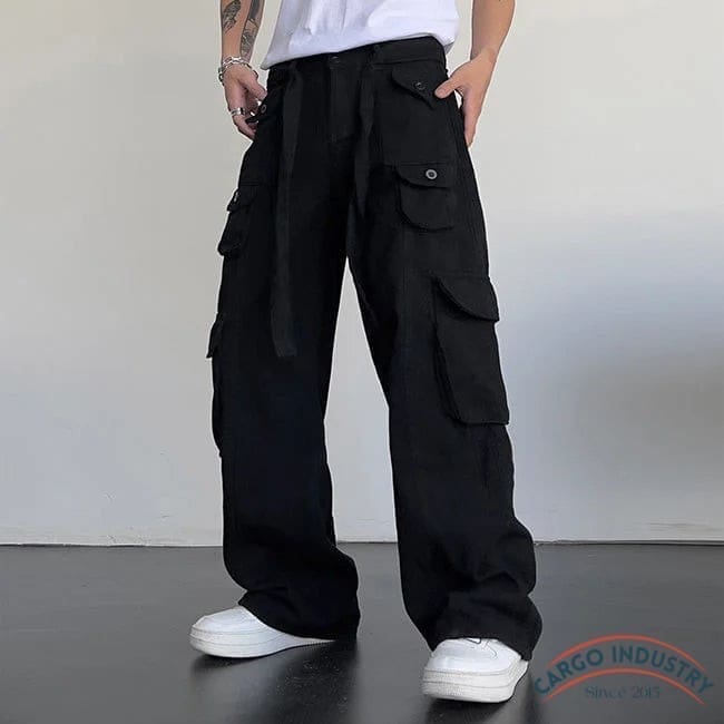 Un vêtement streetwear pour homme idéal pour les amateurs de mode urbaine, ce pantalon cargo coupe large est doté de poches latérales boutonnées offrant un espace de rangement pratique pour les petits objets essentiels. La coupe large offre une grande liberté de mouvement et des passants pour ceinture pour un ajustement personnalisé. De plus, son style élégant est complété par une corde de serrage en tissu plat à la taille.
