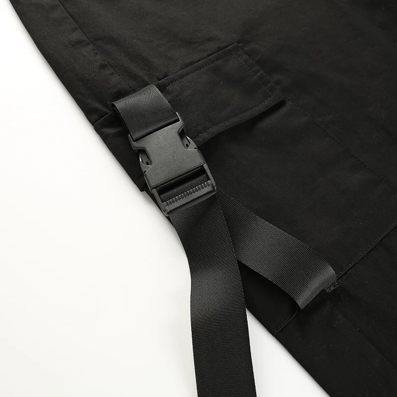 Equipé de sangles et de plusieurs poches, ce pantalon combine à la fois confort, utilité et style streetwear futuriste. Inspiré de différents thèmes, tels que le style cyberpunk, militaire et darkwear, ce pantalon cargo est un indispensable pour adopter la mode techwear, si admirable et si classe.