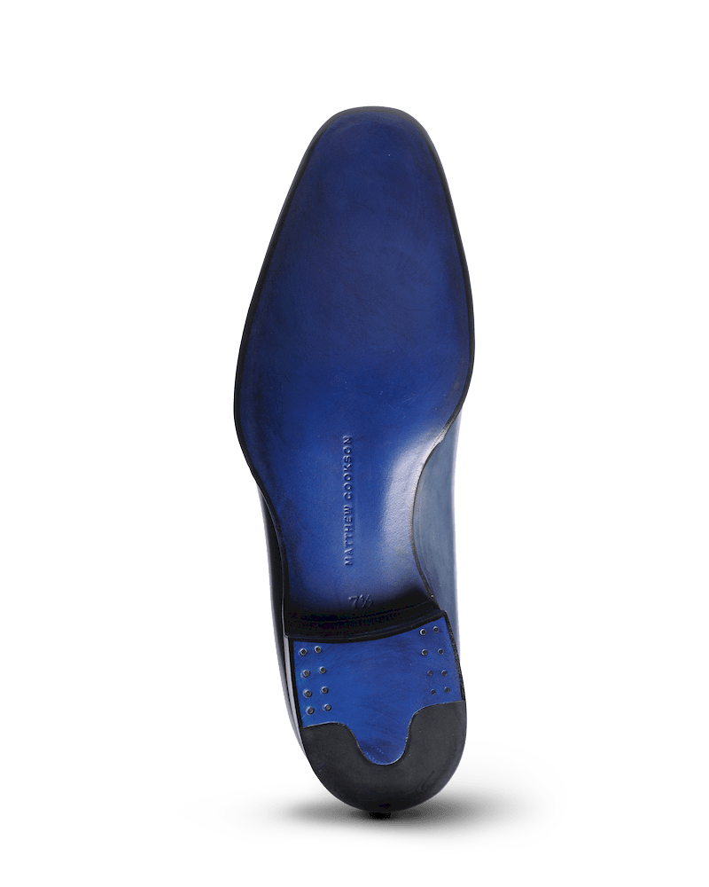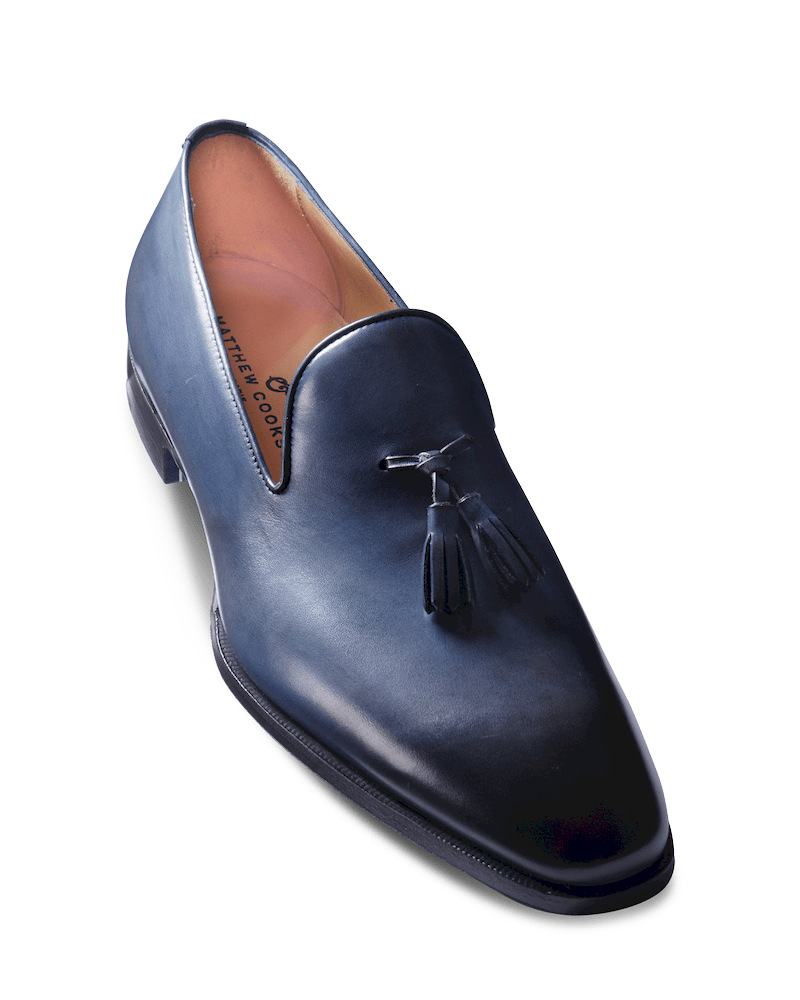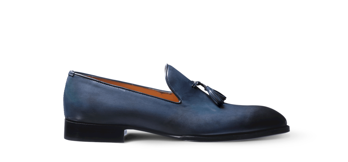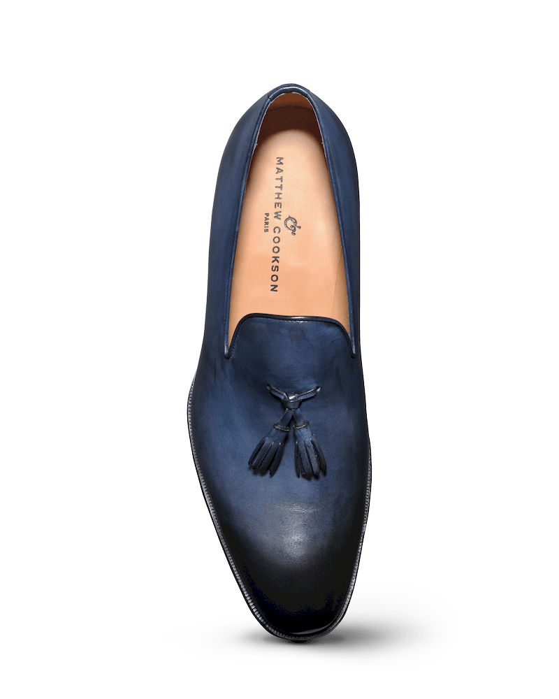 Mocassin à pampilles en veau bleu patiné à la main monté sur semelle cuir. La fabrication en cousu blake est sous gravure fermée. La simplicité et l’élégance à l’état pure.