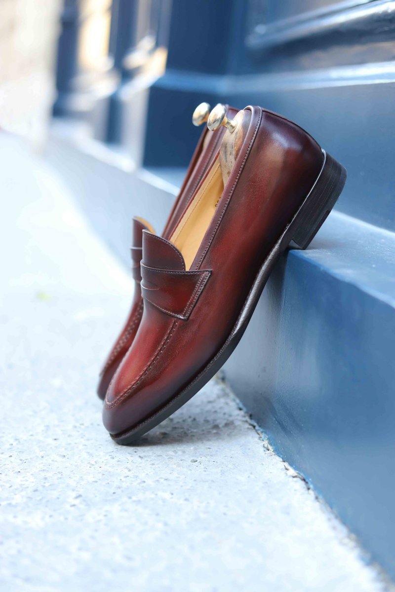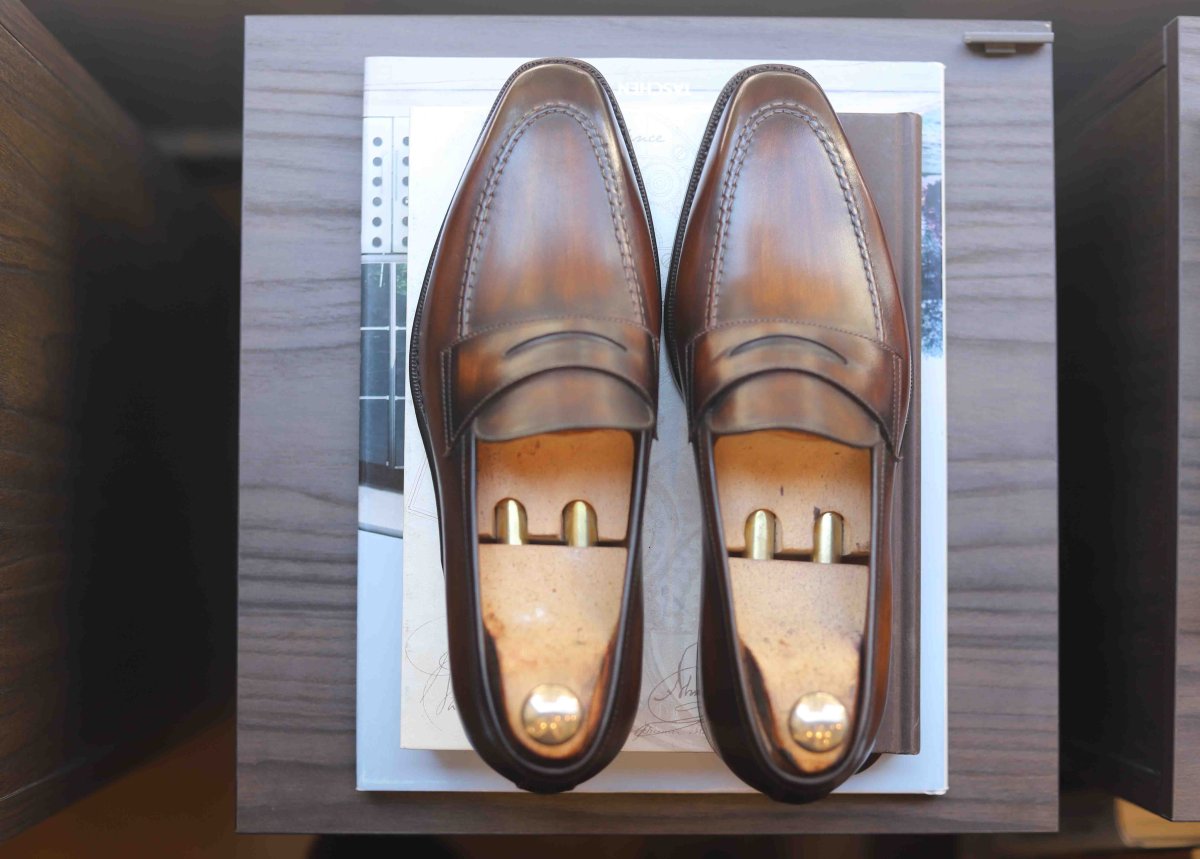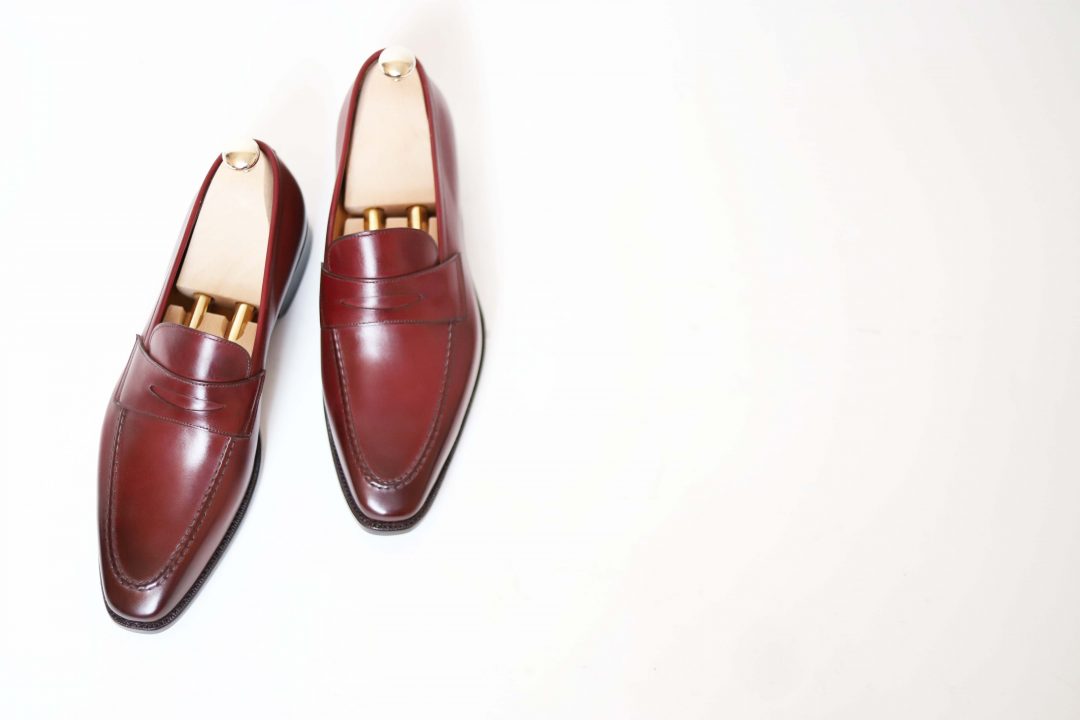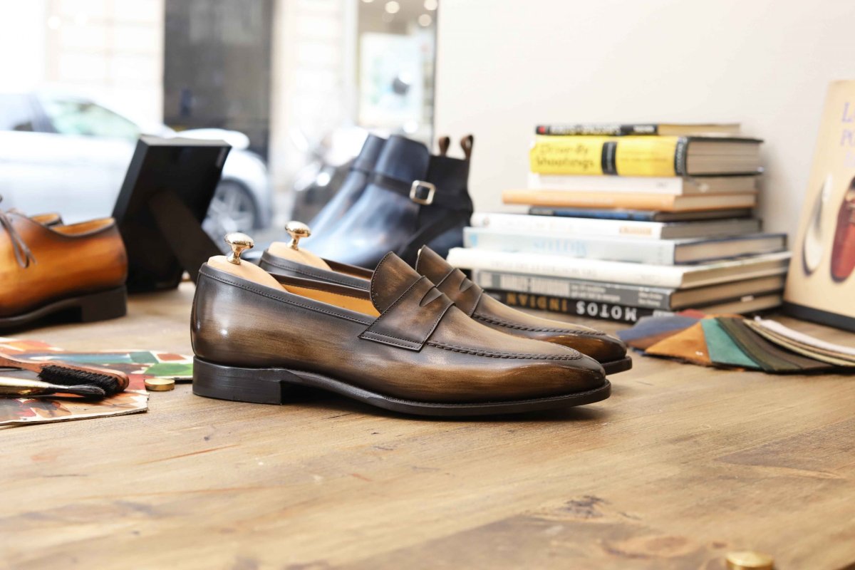 Penny loafer Last : 374 (fine shape) Leather : Box calf (du Puy tannery , France) Lining : Calf Sole : Extra slow tanned leather Cambrion : Double wood highlighted Welt : Goodyear To choose your patina, nothing could be simpler: send us a message via the « contact » tab describing your wish! Do not hesitate to attach photos.