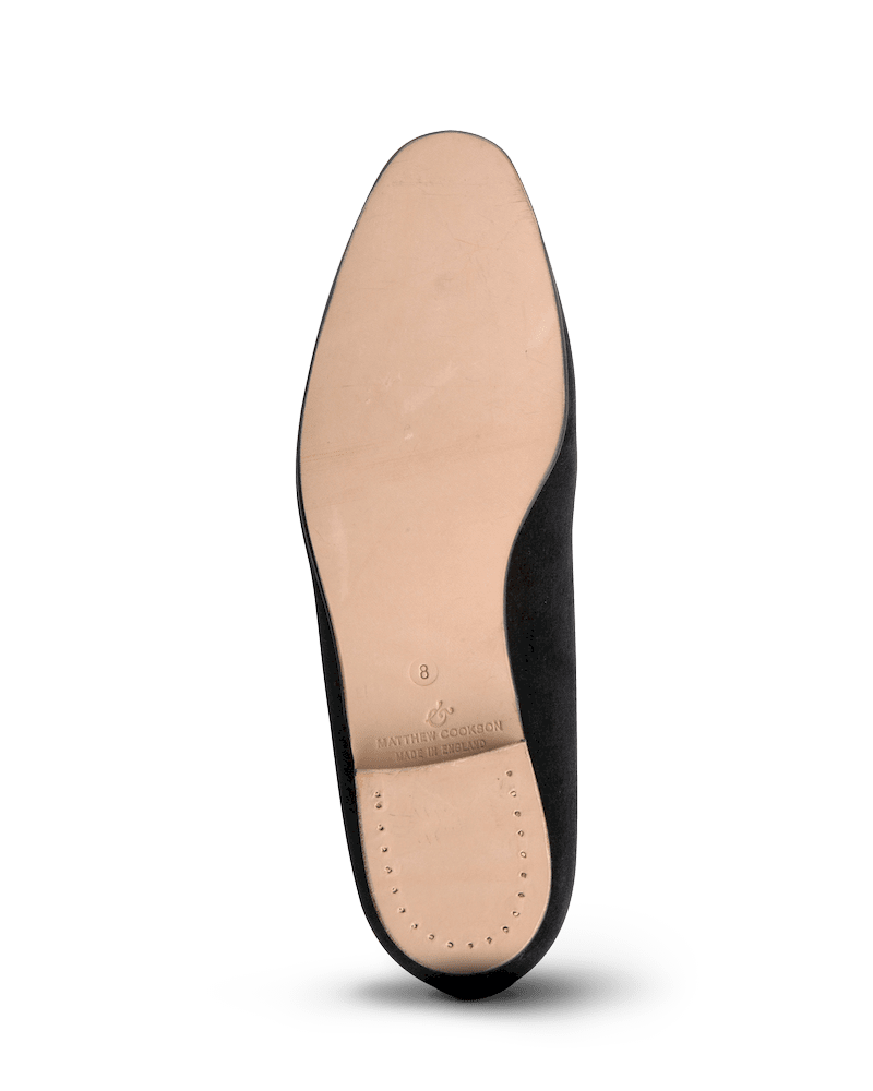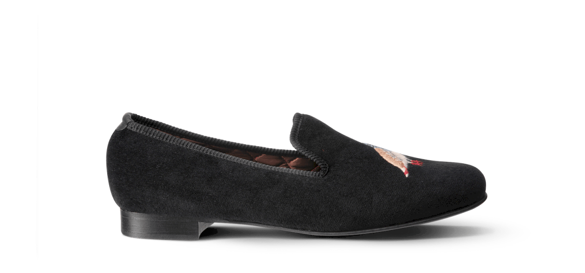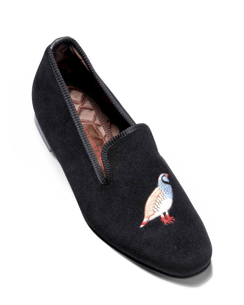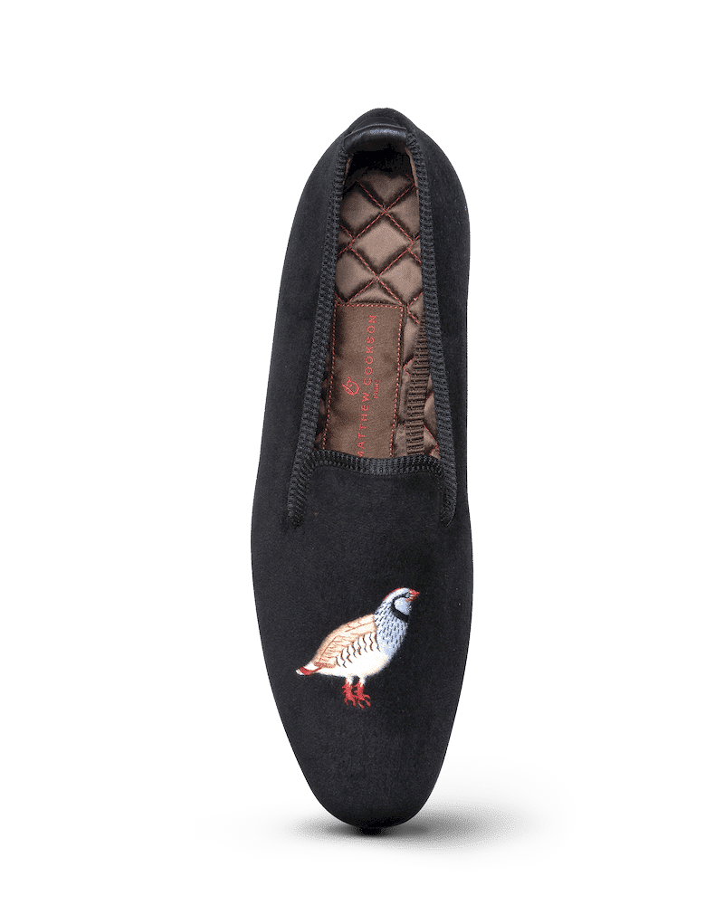 Les slippers perdrix Matthew Cookson sont faites en velours de coton et brodées à la main, la doublure est en satin matelassé, le tout monté sur une fine semelle en cuir. Le summum de l’élégance et du confort.