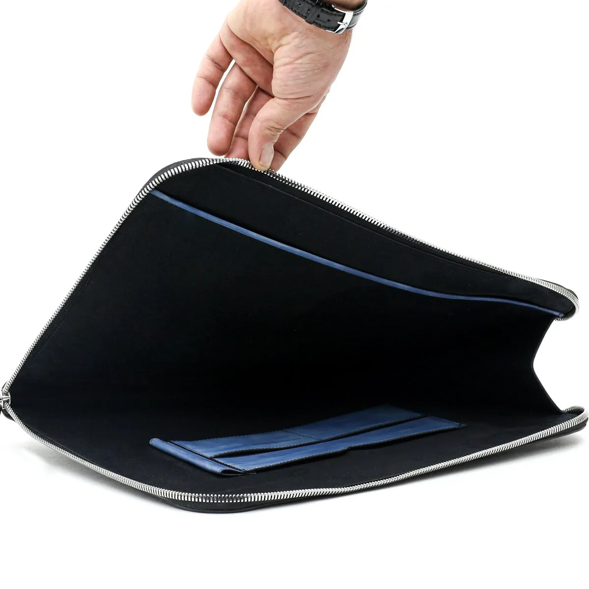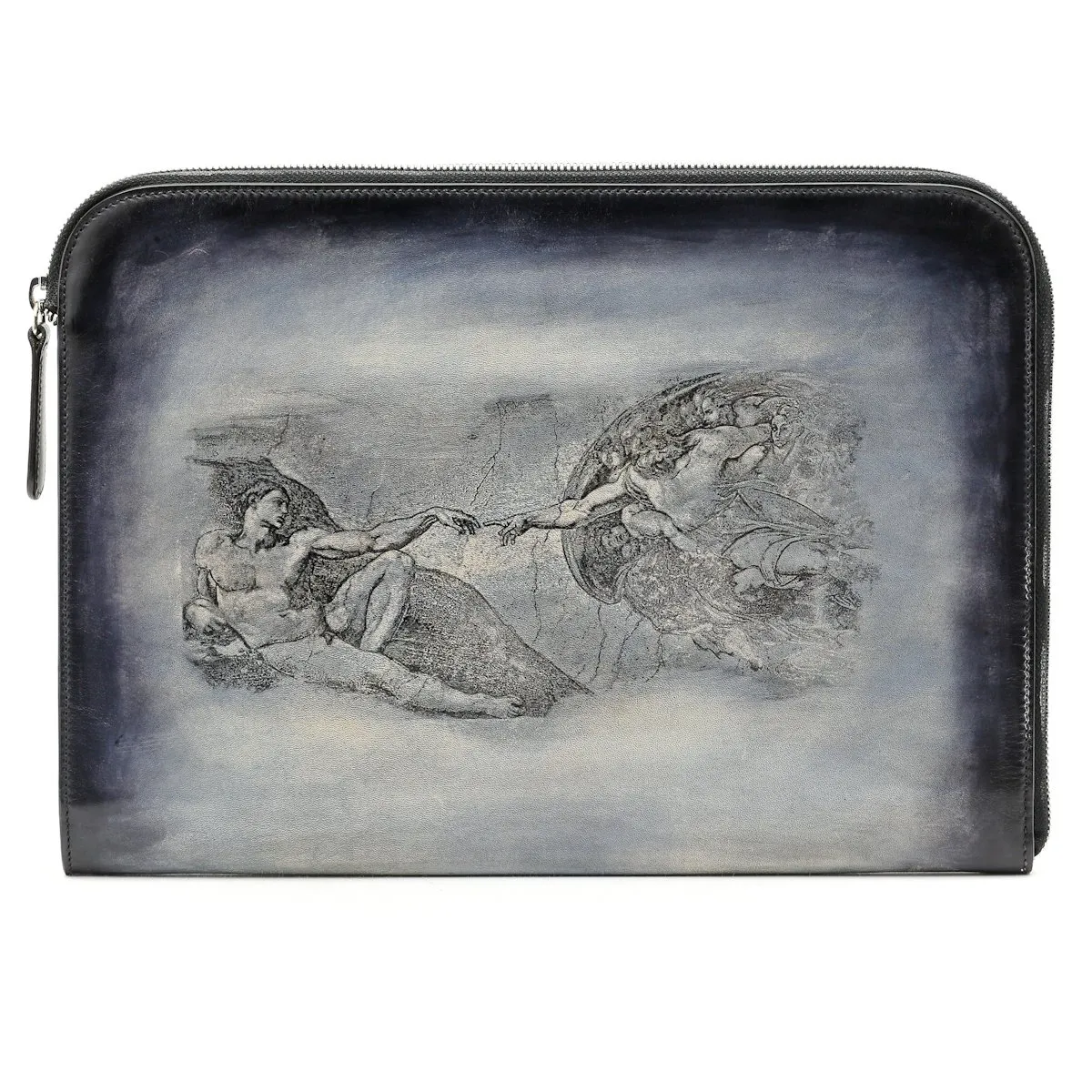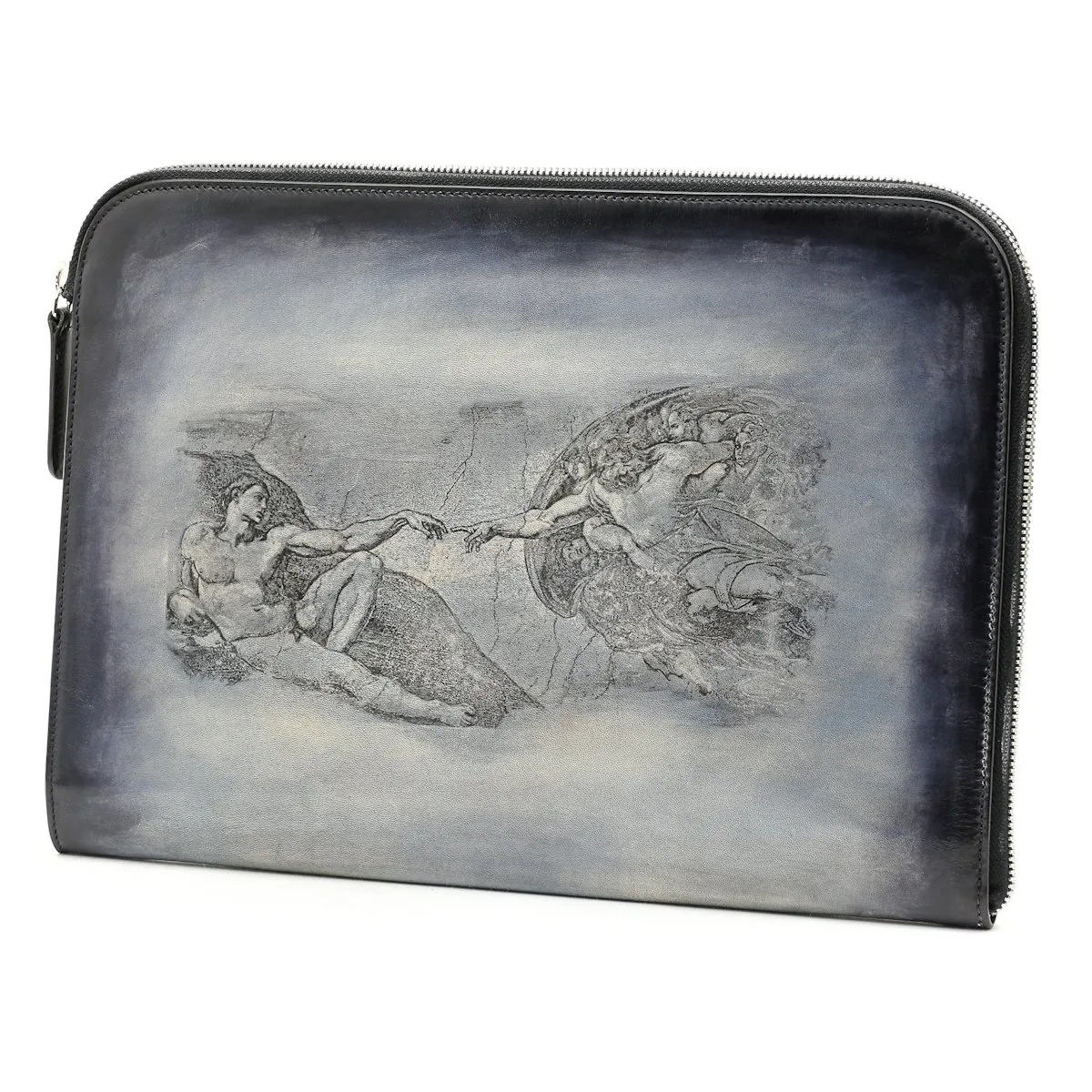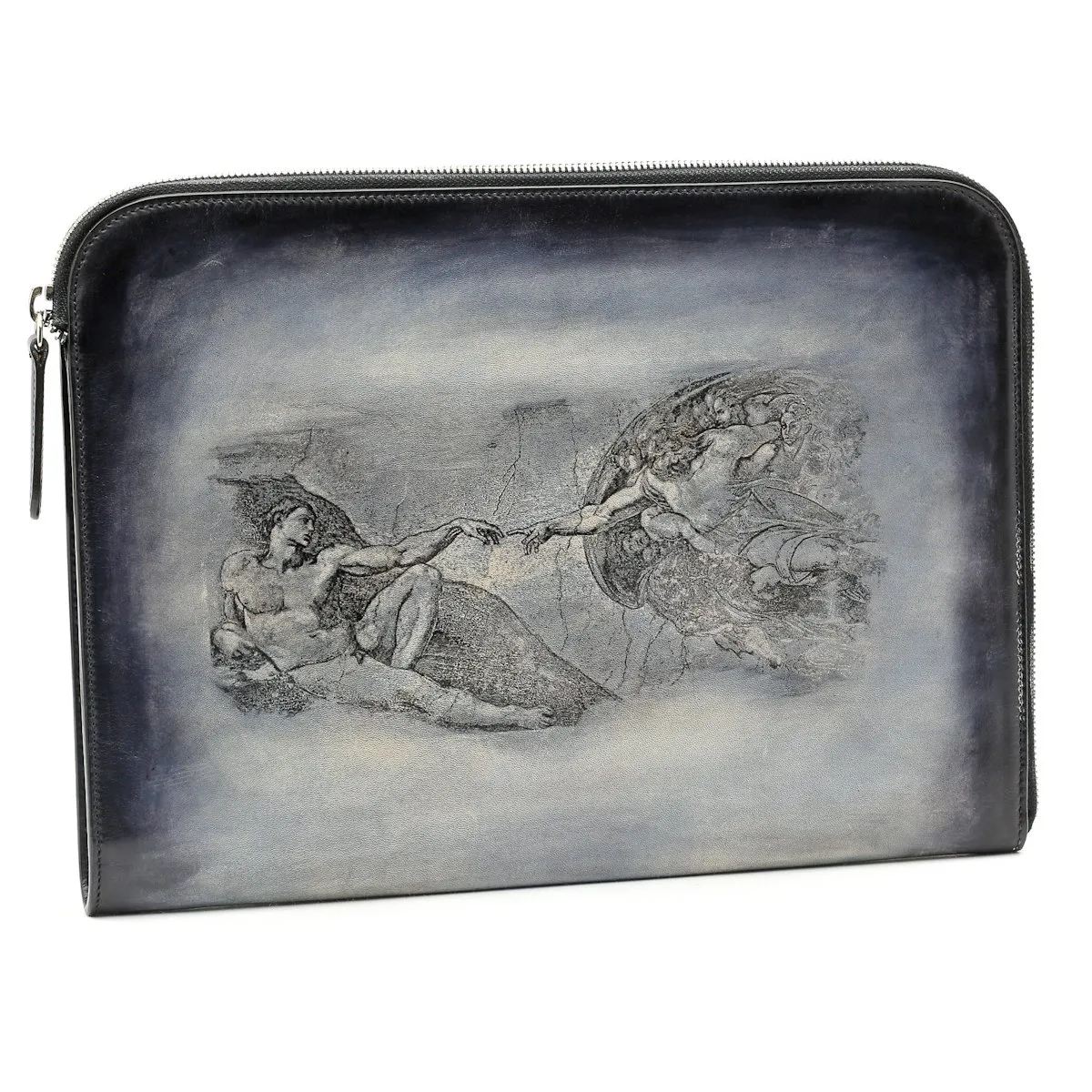 PIÈCE UNIQUE. Cette pochette Gabriel vous permettra de transporter votre ordinateur portable, tablette et contrats. Elle est ici présentée dans une patine bleu ciel et transparence de Michel-Ange…