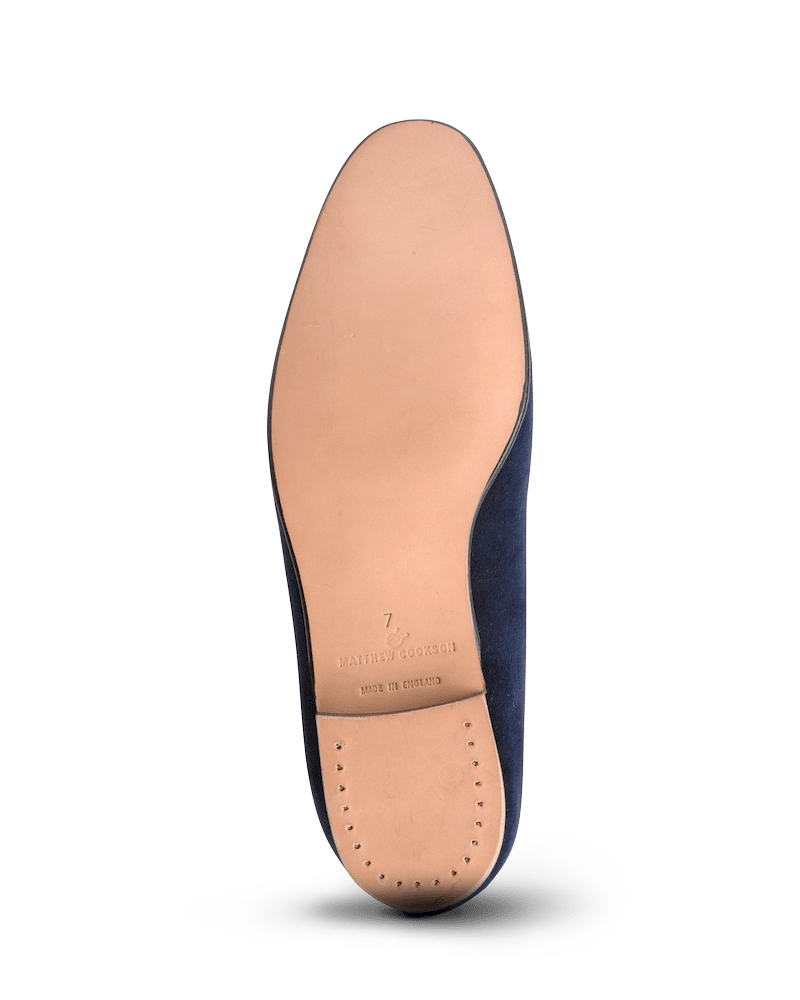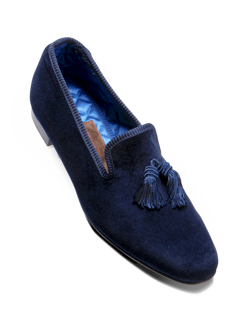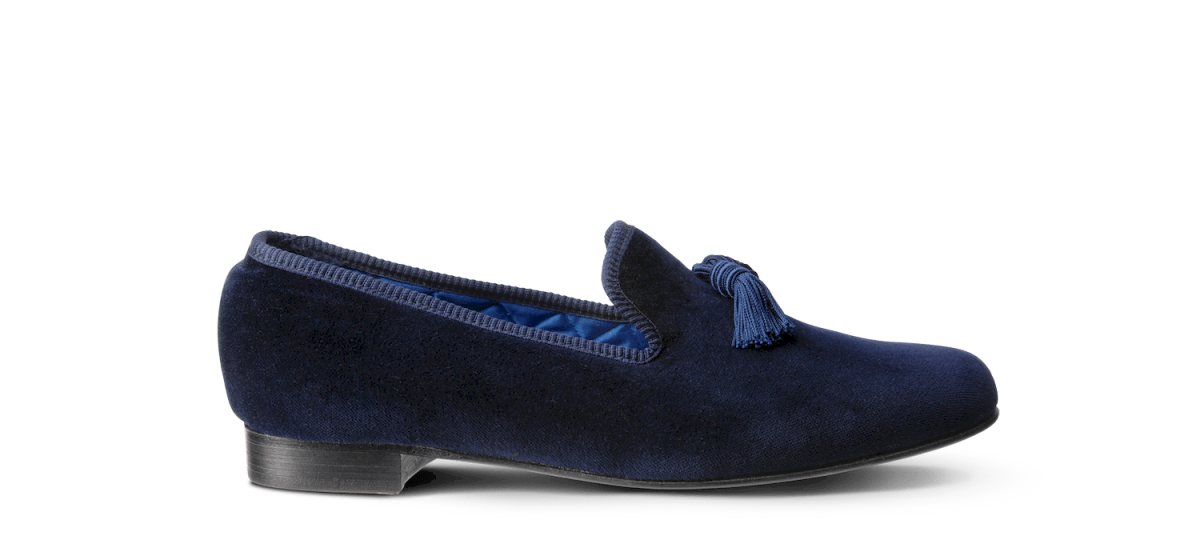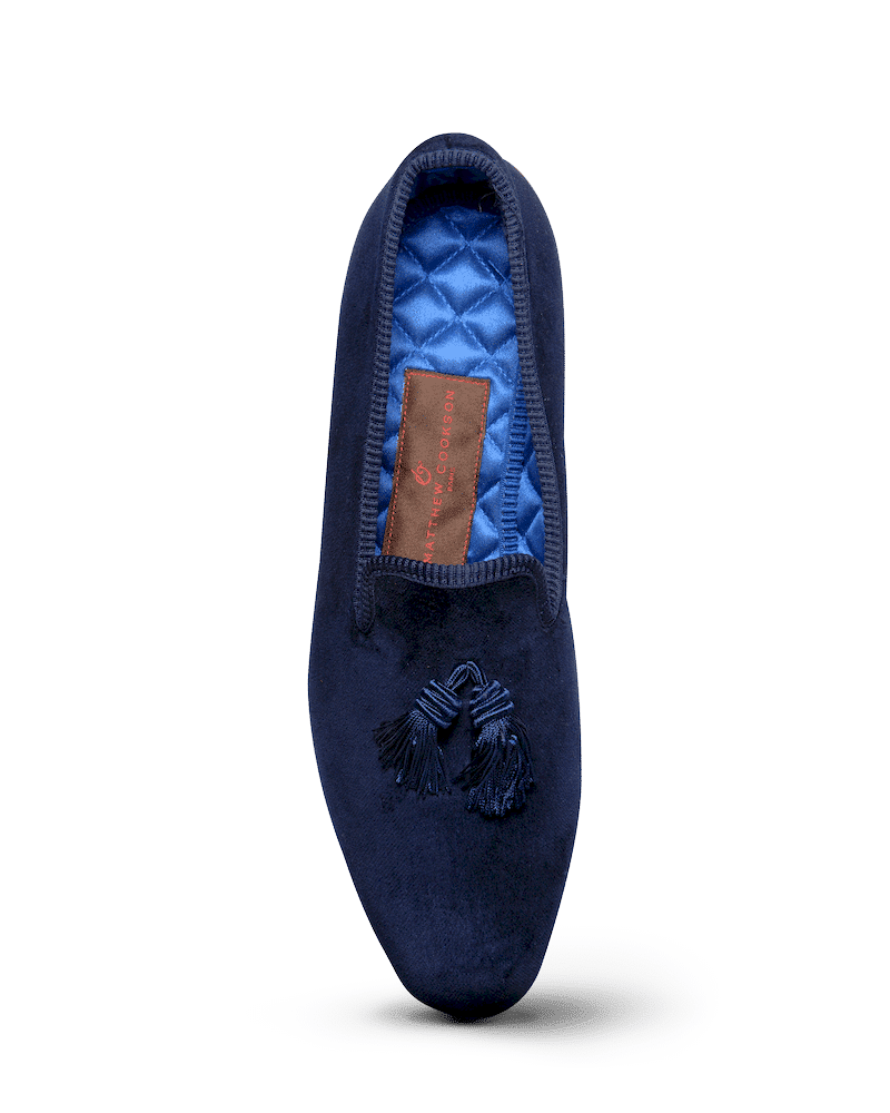Les slippers pompons bleu nuit Matthew Cookson sont faites en velours de coton, la doublure est en satin matelassé, le tout monté sur une fine semelle en cuir. Le summum de l’élégance et du confort.