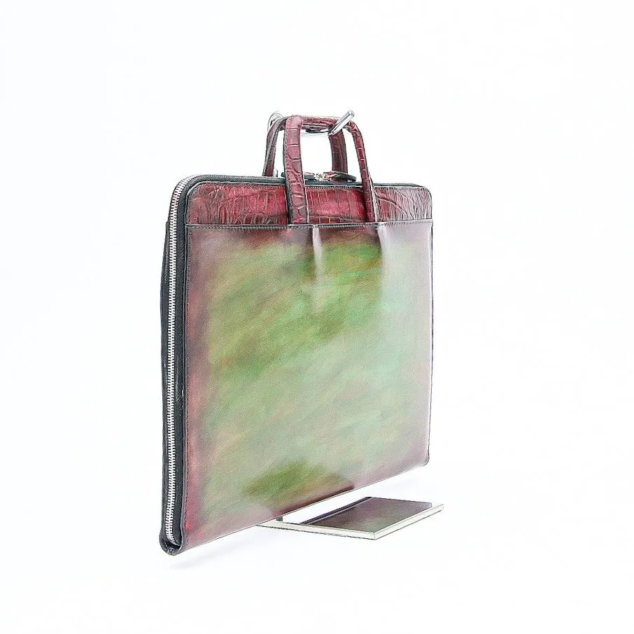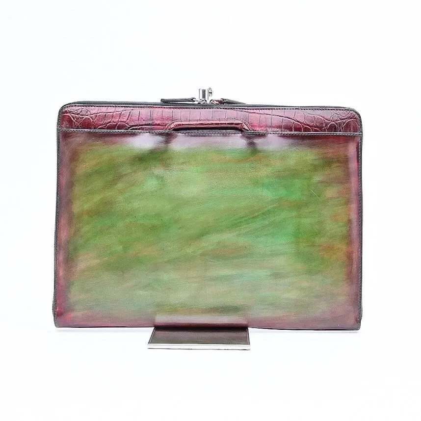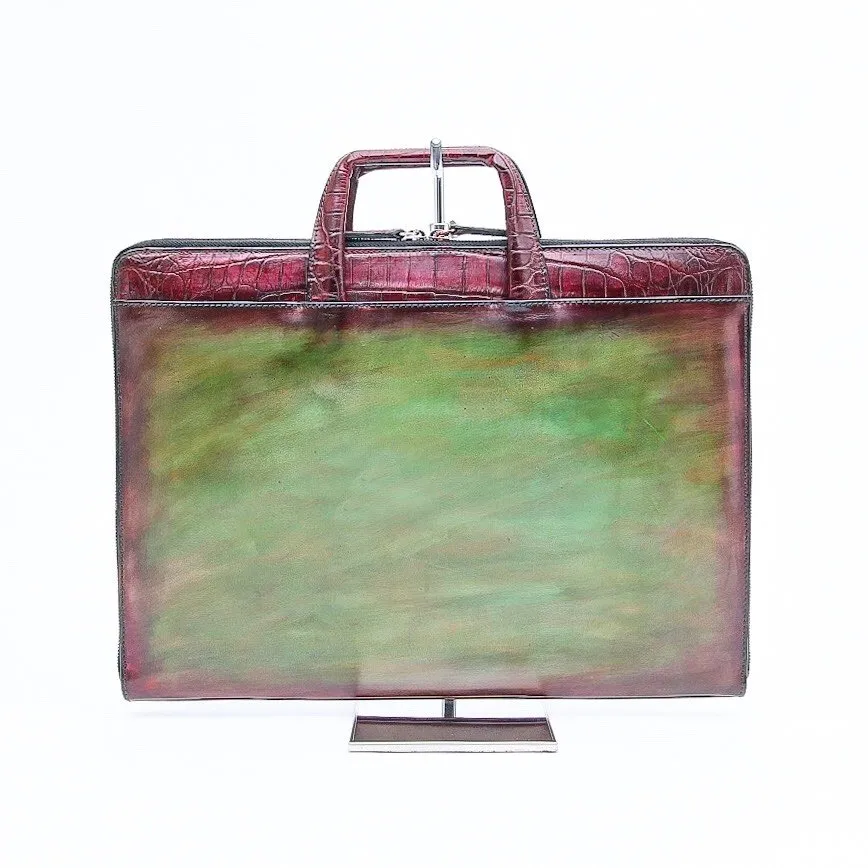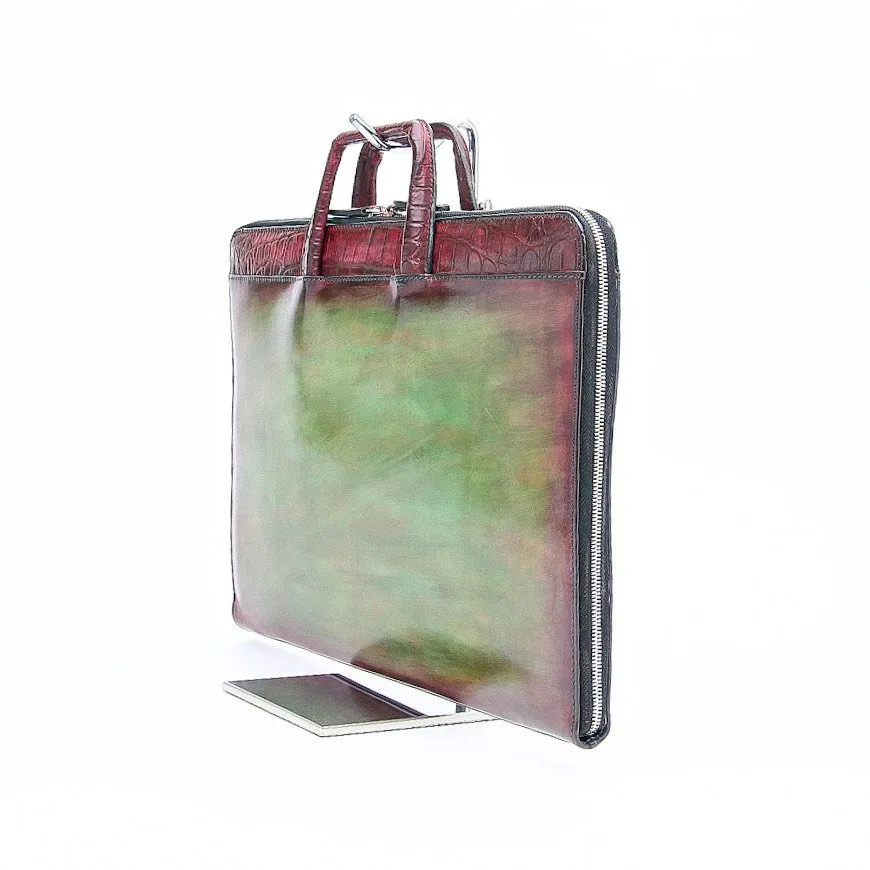 Ce porte documents Eden, en bi-matière crocodile et box calf à patiner vous permettra de mettre tout ce dont vous avez besoin pour votre journée de travail. Son sytème de poignée est rétractable est permet ainsi un meilleur rangement.