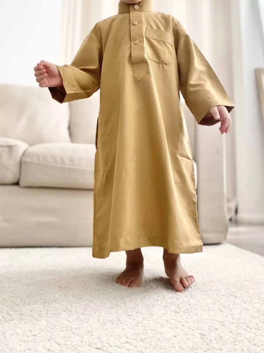 Le qamis saoudien pour enfant est un vêtement traditionnel à la fois pratique et élégant. Conçu avec un tissu léger et respirant, il assure un grand confort à votre enfant. Quel que soit le temps qu’il fait. La coupe ample permet à votre enfant de se déplacer facilement, et les manches longues offrent une protection contre les rayons du soleil.