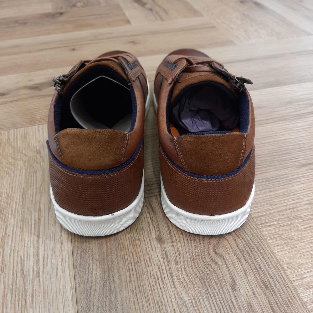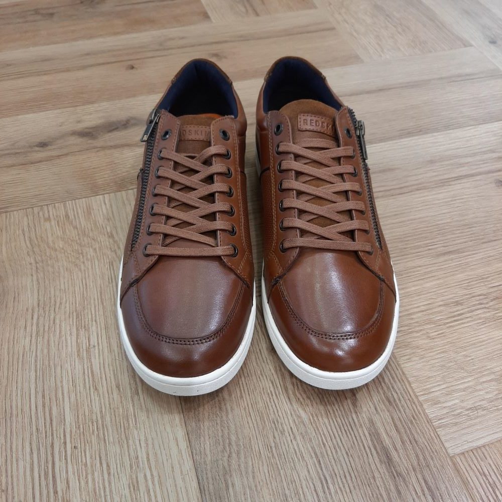 Chaussures REDSKINS couleur cognac en cuir pour hommes. Chaussures pour hommes de style « sneakers ». Fait à base de cuir de vachette véritable. Design innovant avec fermeture élégante à glissière sur le côté extérieur. Coutures solides et lacets de qualité supérieure. Logo estampillé sur le côté. Patchs de cuir aux textures variées pour une allure unique et recherchée. Semelle de cuir blanche qui s’accorde parfaitement aux couleurs marrons et noires. Chaussures basses de coupe décontractée qui s’adapte à quasiment toutes les tenues de ville. Assez confortables et respirantes pour vous accompagner autant dans les activités quotidiennes que lors de vos sorties du week-end.