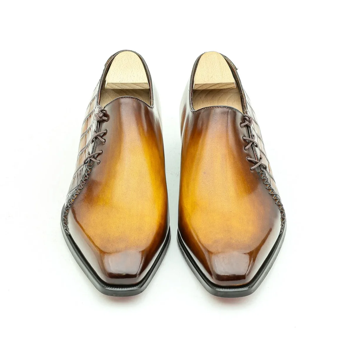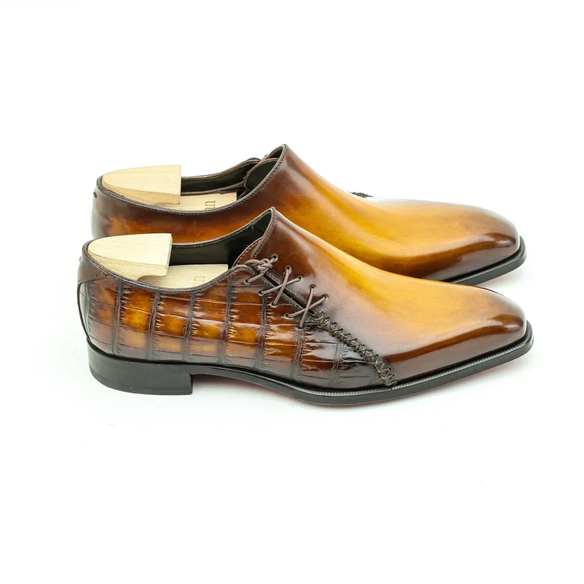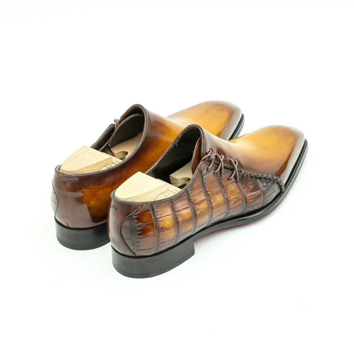 Le Lucas est un richelieu à laçage latéral et surpiqûre Mohican en continuité des œillets. Empeigne unie sur forme « Senzo » aux flans marqués, Lucas fera honneur à votre silhouette. Un caractère élancé pour ce modèle plus « casual super chic » que classique, ou comment rester habillé toute en décontraction. Présenté ici dans une version Commande Spéciale, flancs latéraux en crocodile. Patine Caramel