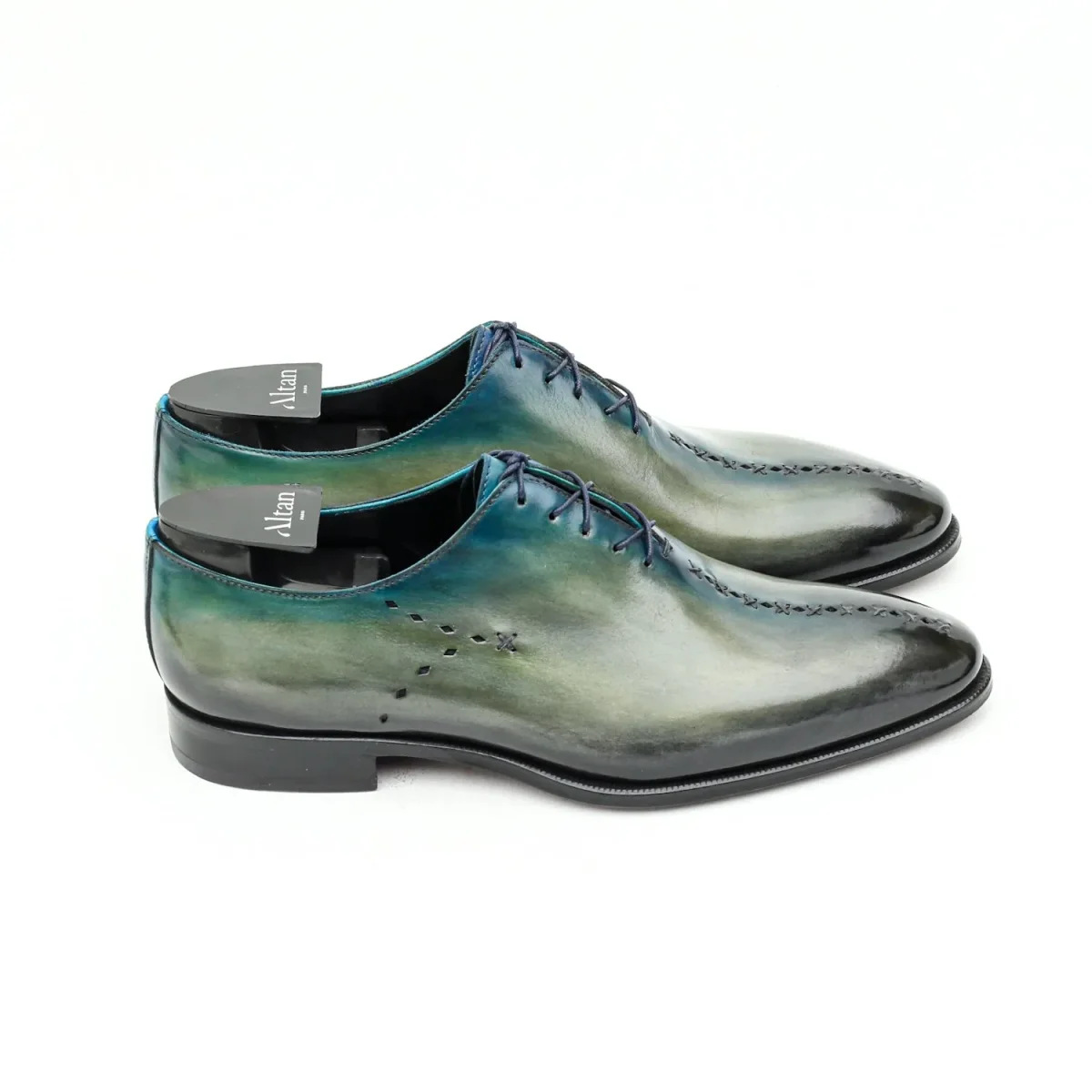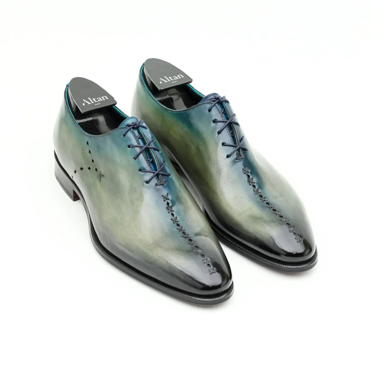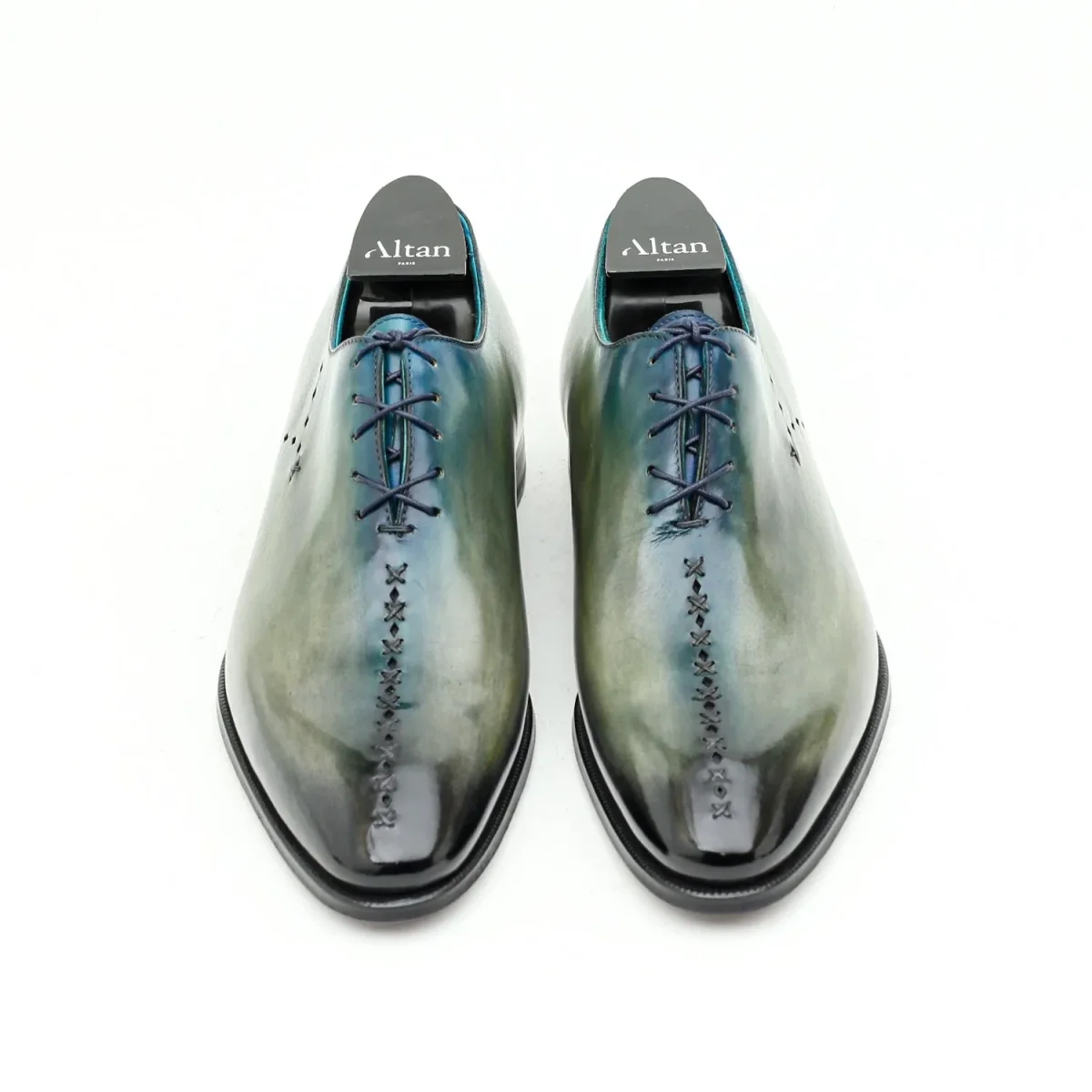 Ce Richelieu pour homme est réalisé sur la base d’une seule pièce de cuir agrémentée d’une succession de perforations et de sur-piqures en croix.