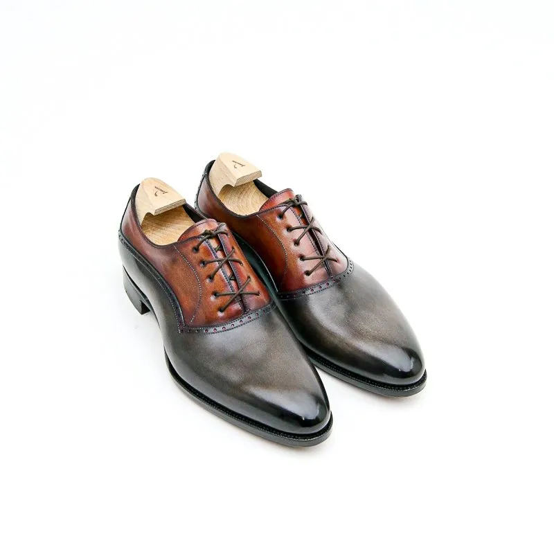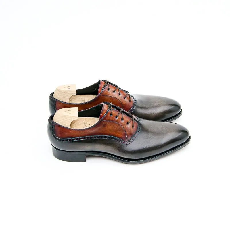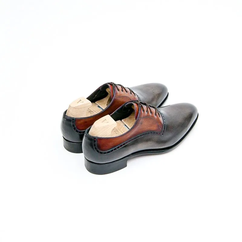 Augustin est un richelieu à balmoral. Monté sur notre forme Goodyear Millenium c’est un modèle classique et élégant. En box de tannage végétale la patine est à la carte. Présenté ici dans une patine bi-colore, balmoral fauve orangé et tige gris brun sanglier.
