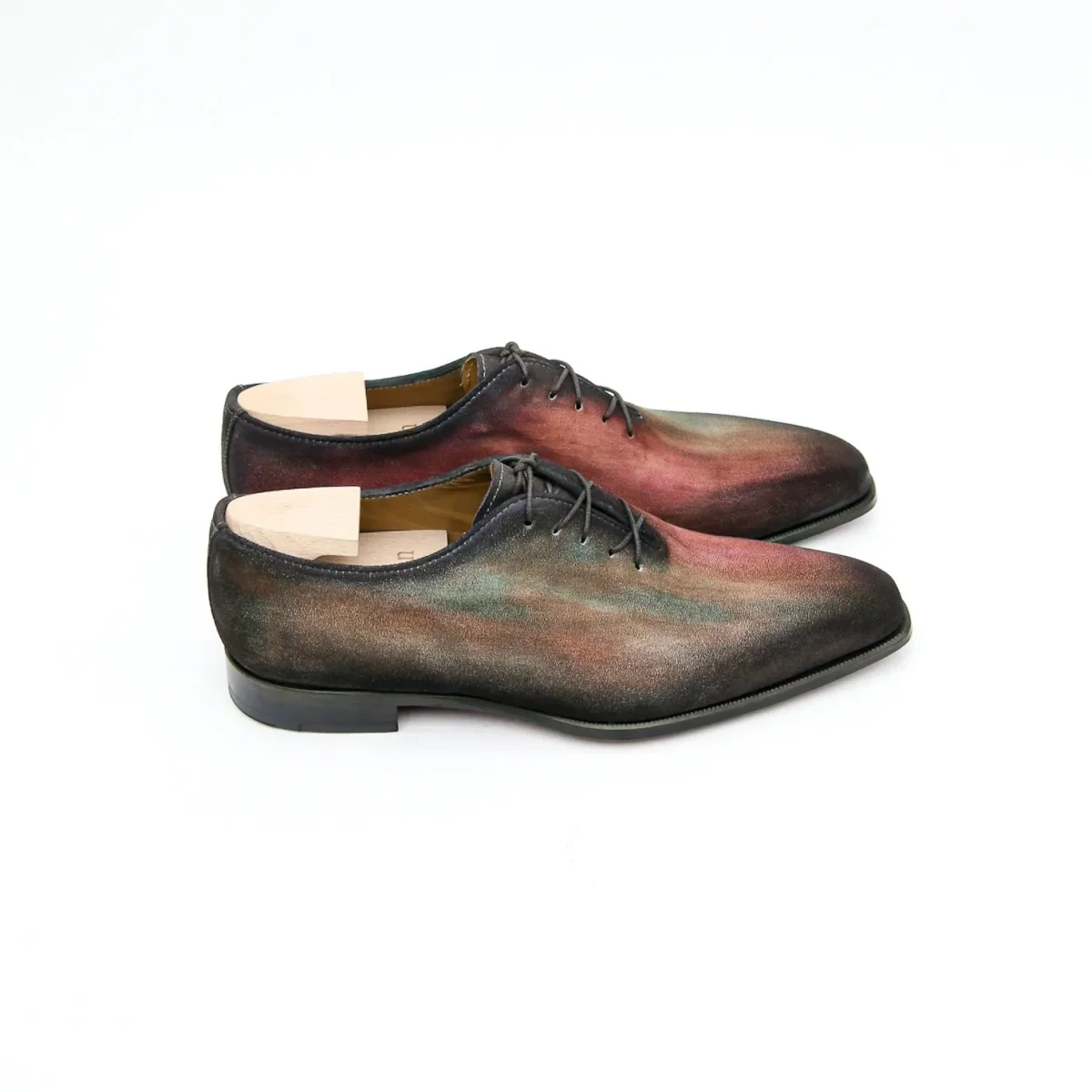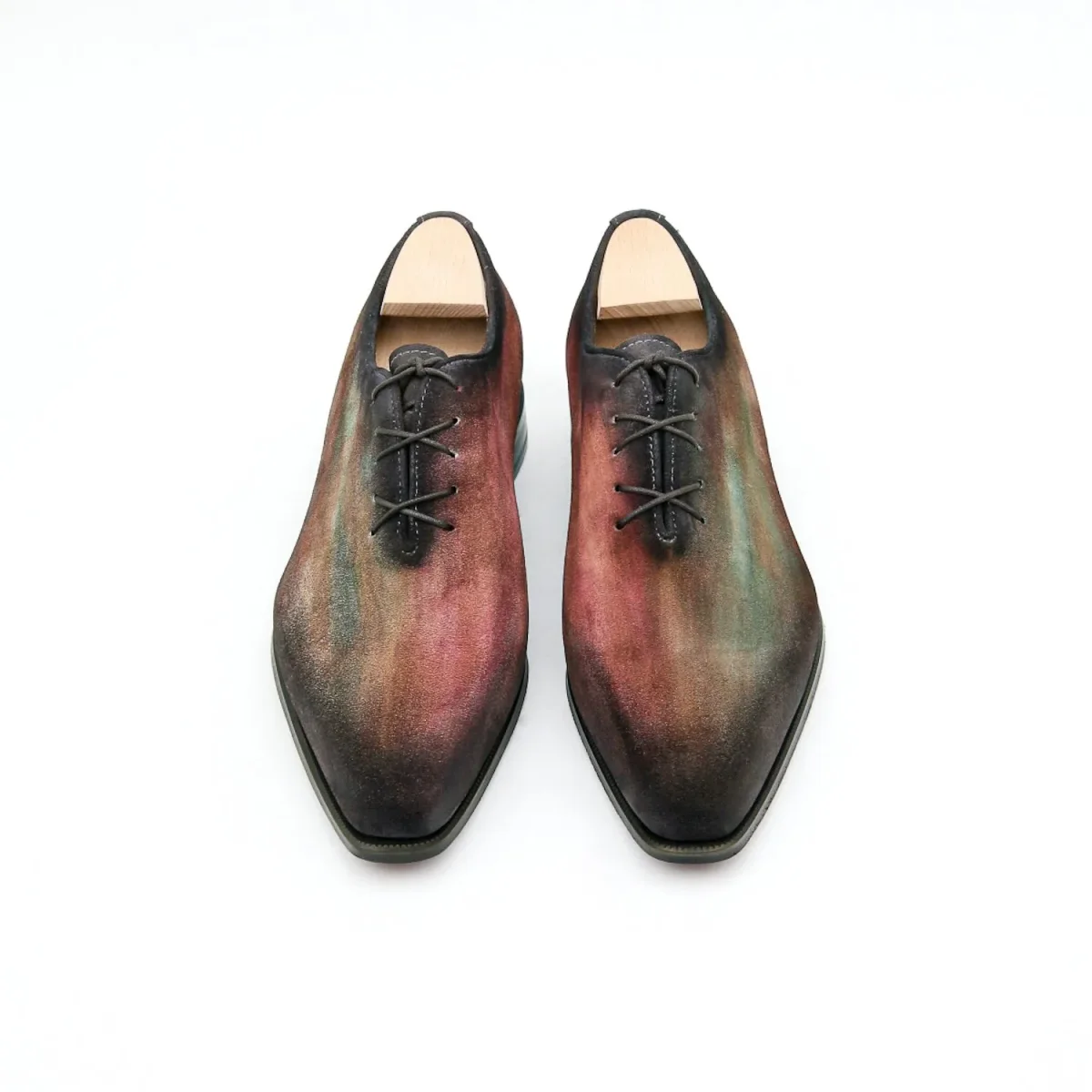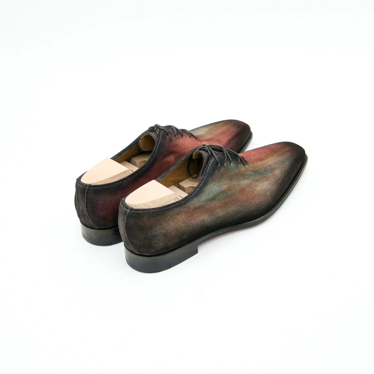 Version en veau velours à patiner de notre Richelieu One Cut 2, il présente les mêmes caractéristiques que son homologue en box à patiner : montage blake sous gravure, forme Stop à bout carré atténué et flancs marqués, passepoils à l’anglaise. En veau velours à patiner, ce modèle classique et plutôt formel dans son usage en devient « casual ». Cette paire de chaussure conviendra parfaitement en toute saison selon le choix de la patine que vous ferez. Bleu ciel dégradé en été, ou marron cognac en automne, ce soulier s’avère finalement être de toutes saisons.
