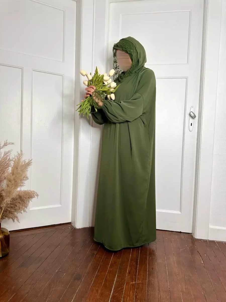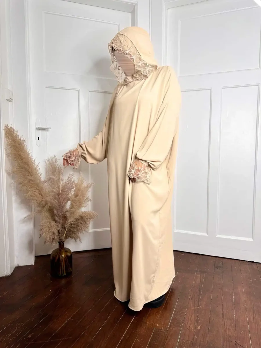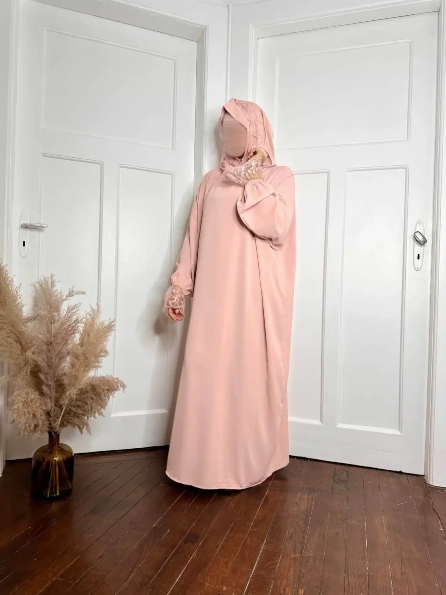 Une robe de prière avec hijab intégré dentelle raffinée et coupe fluide