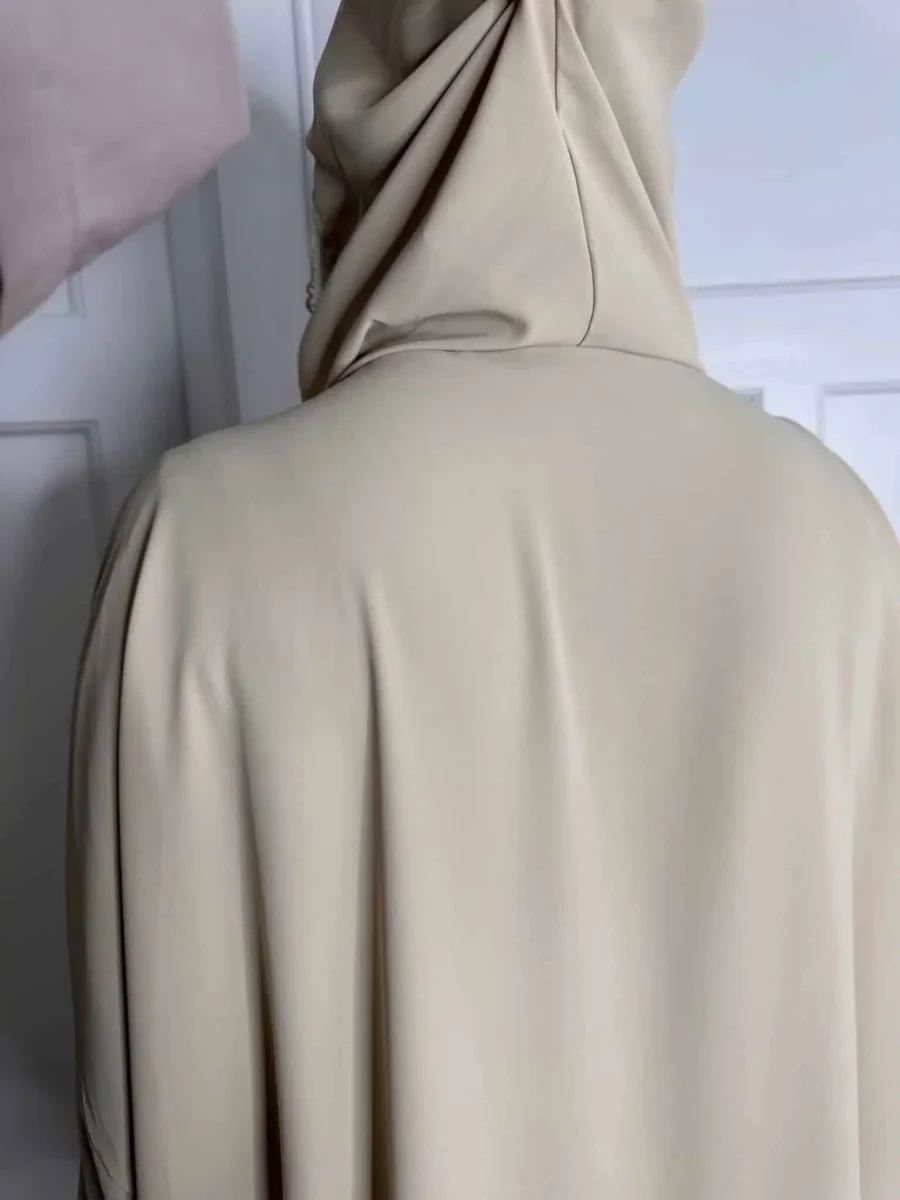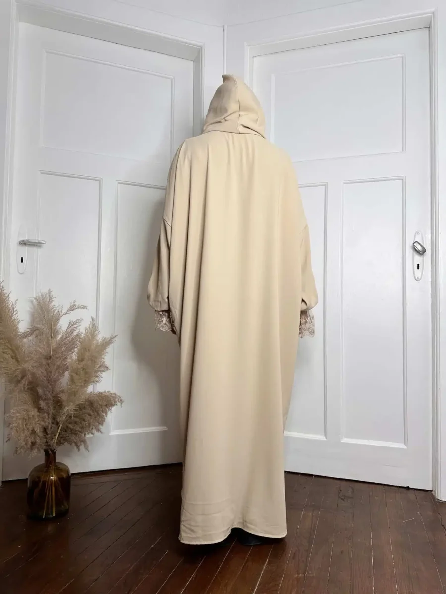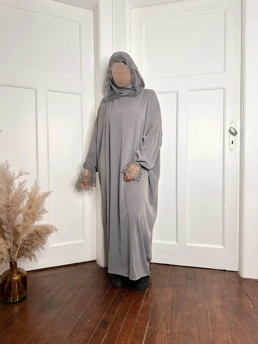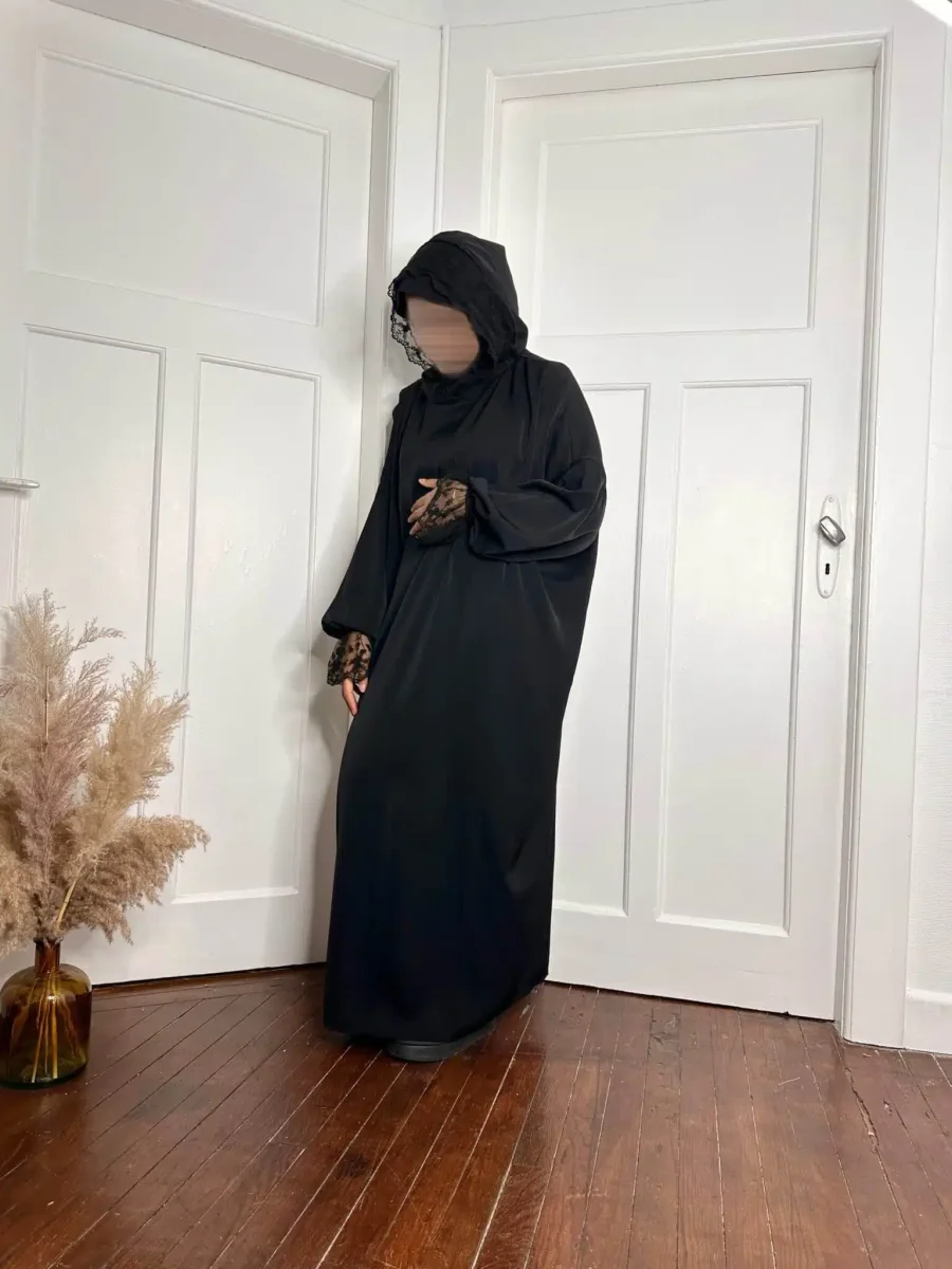 Une robe de prière avec hijab intégré dentelle raffinée et coupe fluide