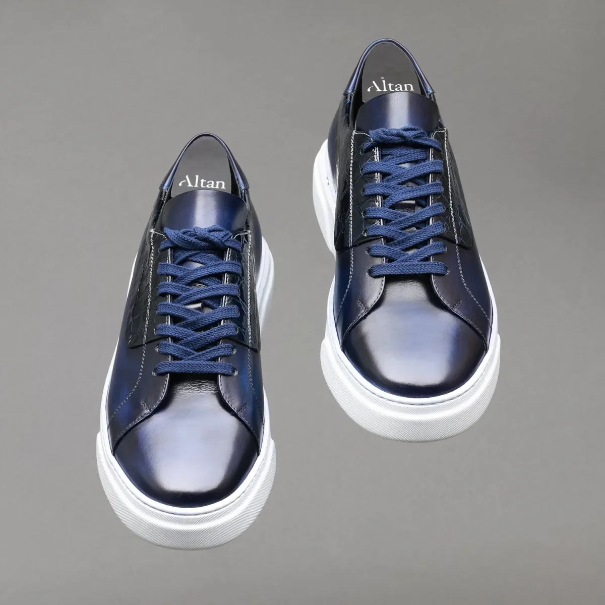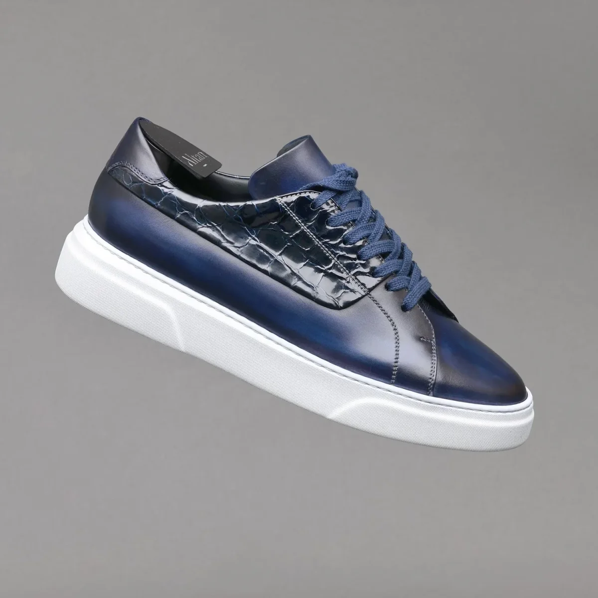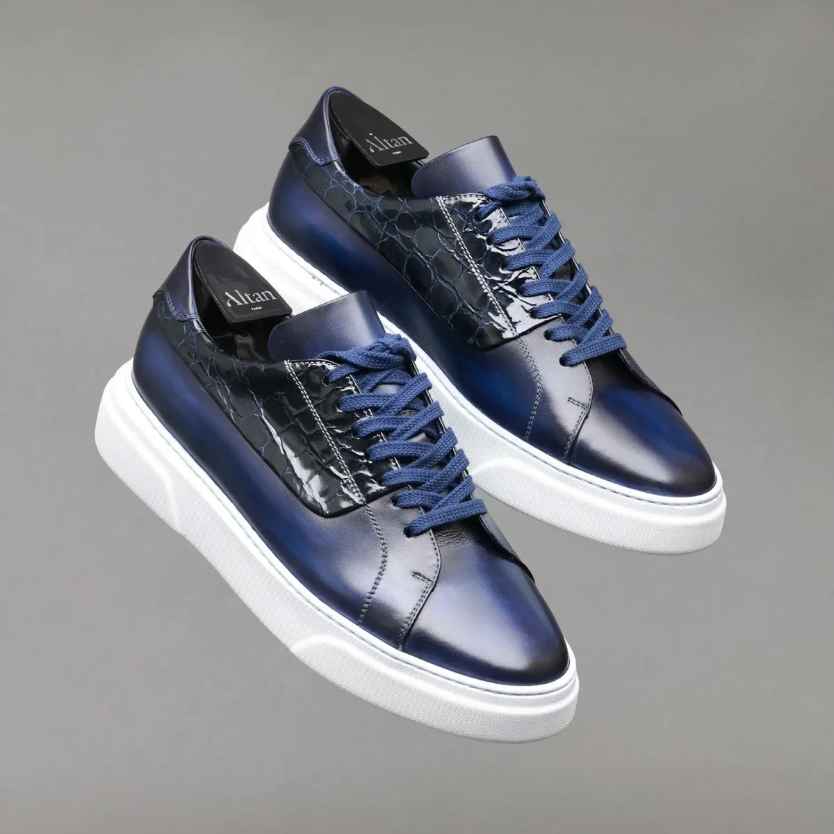 Le Sneaker à Balmoral est réalisé en cuir de veau à patiner. Il reprend l’idée de la découpe dite « Balmoral » caractérisée par ses empiècements de cuir aux niveaux des lacets. Thermocollé sur semelle gomme il offre un confort exceptionnel.