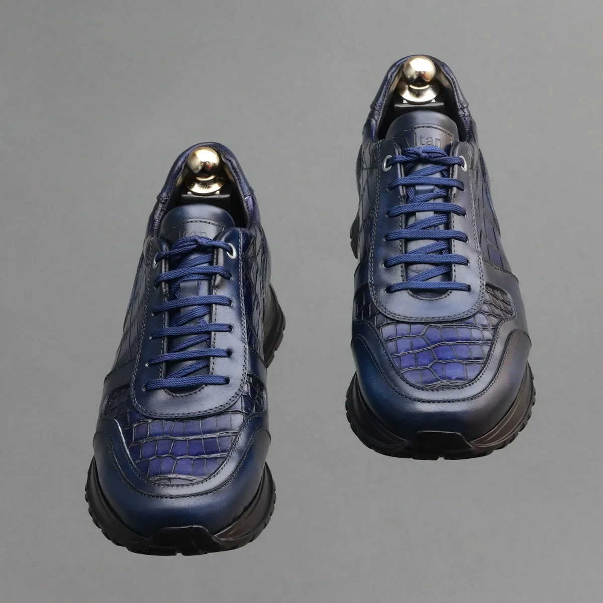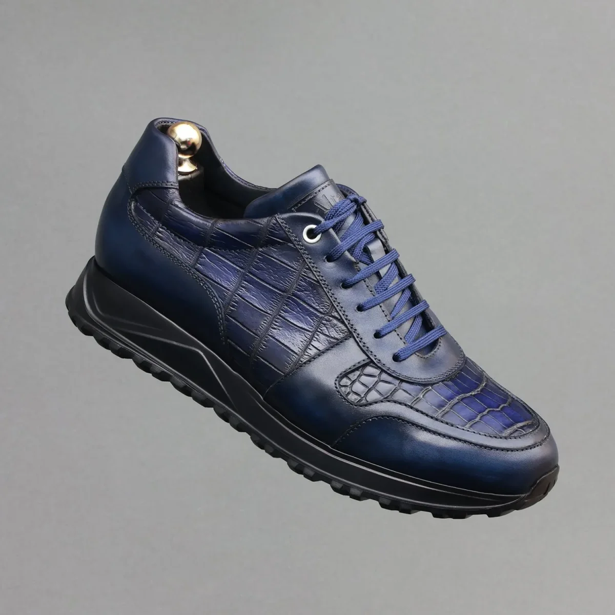 Le Sneacker City 2 est réalisé en cuir de veau et crocodile patiné. Thermocollé sur semelle gomme Extralight, il offre un confort exceptionnel. Ici dans une version précieuse en bi-matière crocodile et veau patiné sur demande.