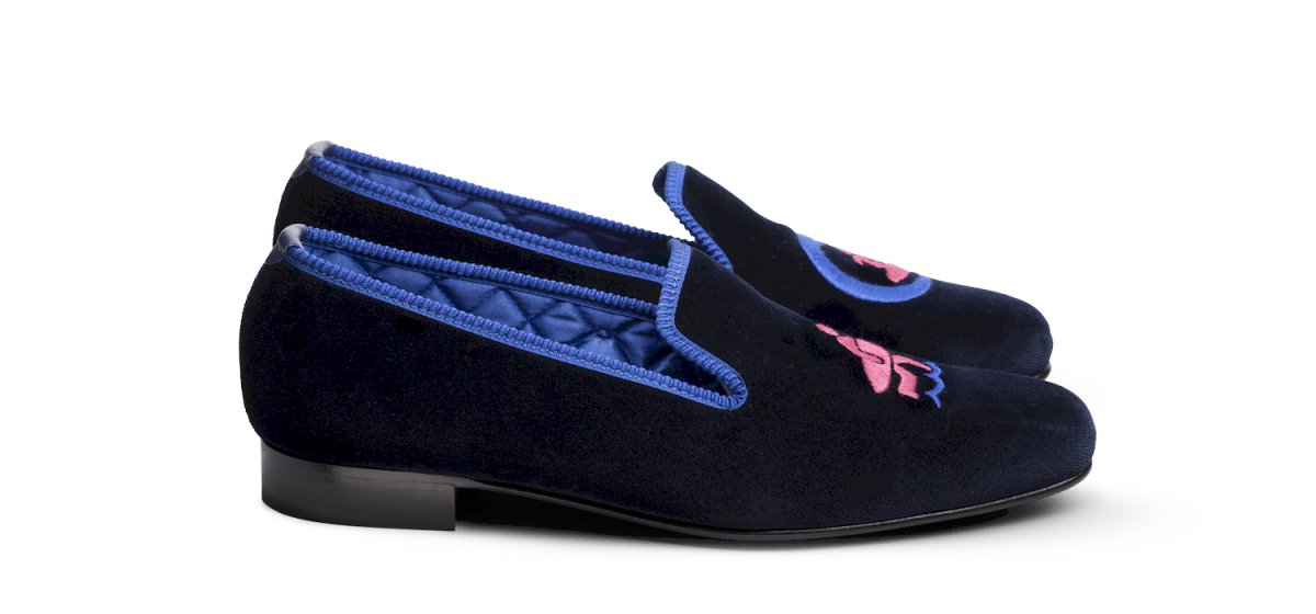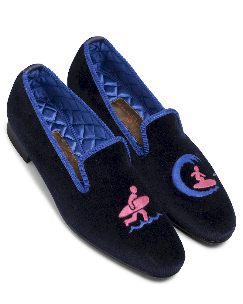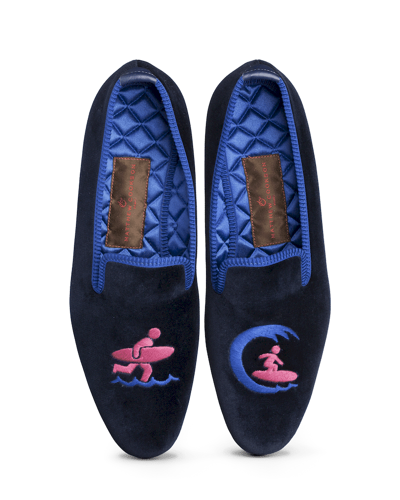 Les slippers surf Matthew Cookson sont faites en velours de coton et brodées à la main, la doublure est en satin matelassé, le tout monté sur une fine semelle en cuir. Le summum de l’élégance et du confort.