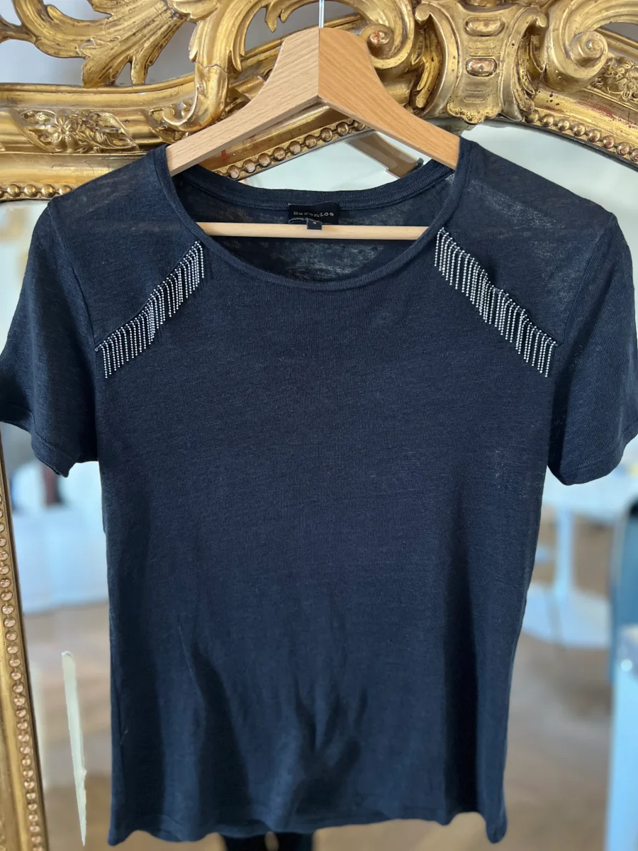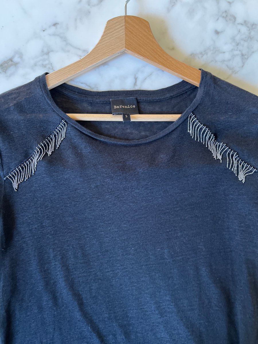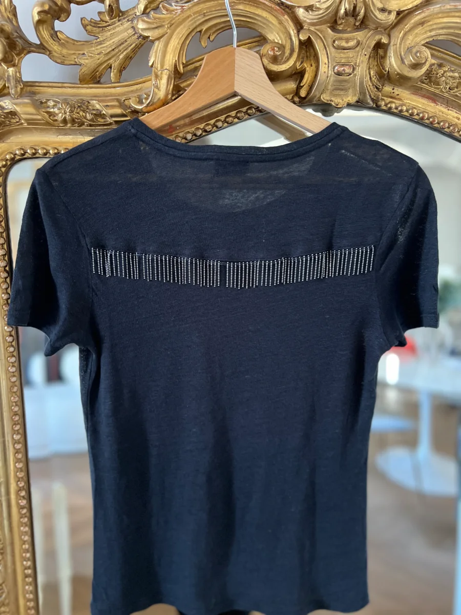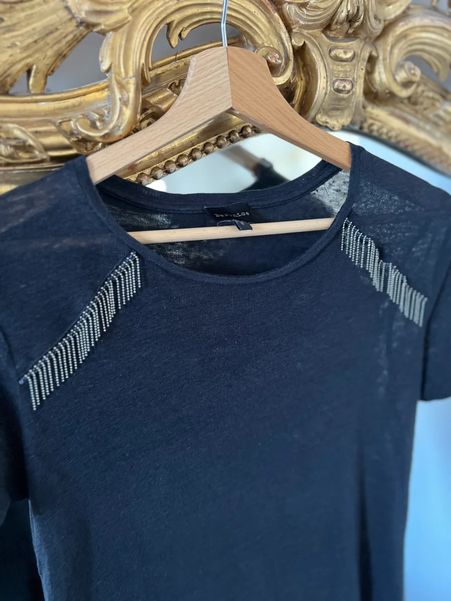 T-shirt Bérénice en lin noir avec franges