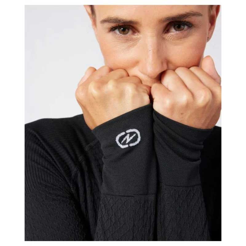 Tricotage 3D et body mapping. Fibres chargées qui gardent la chaleur des infrarouges du corps. Matière qui neutralise les odeurs (>90%).