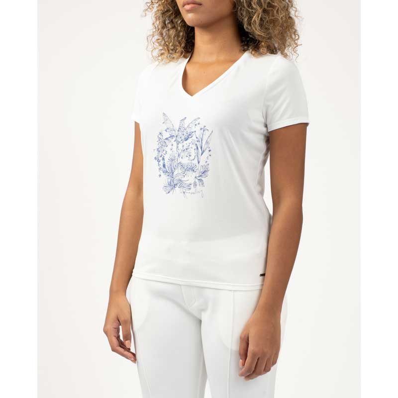En modal et polyester, ce t shirt à large encolure col V est très féminin. Il arbore une sérigraphie douce sur la poitrine.