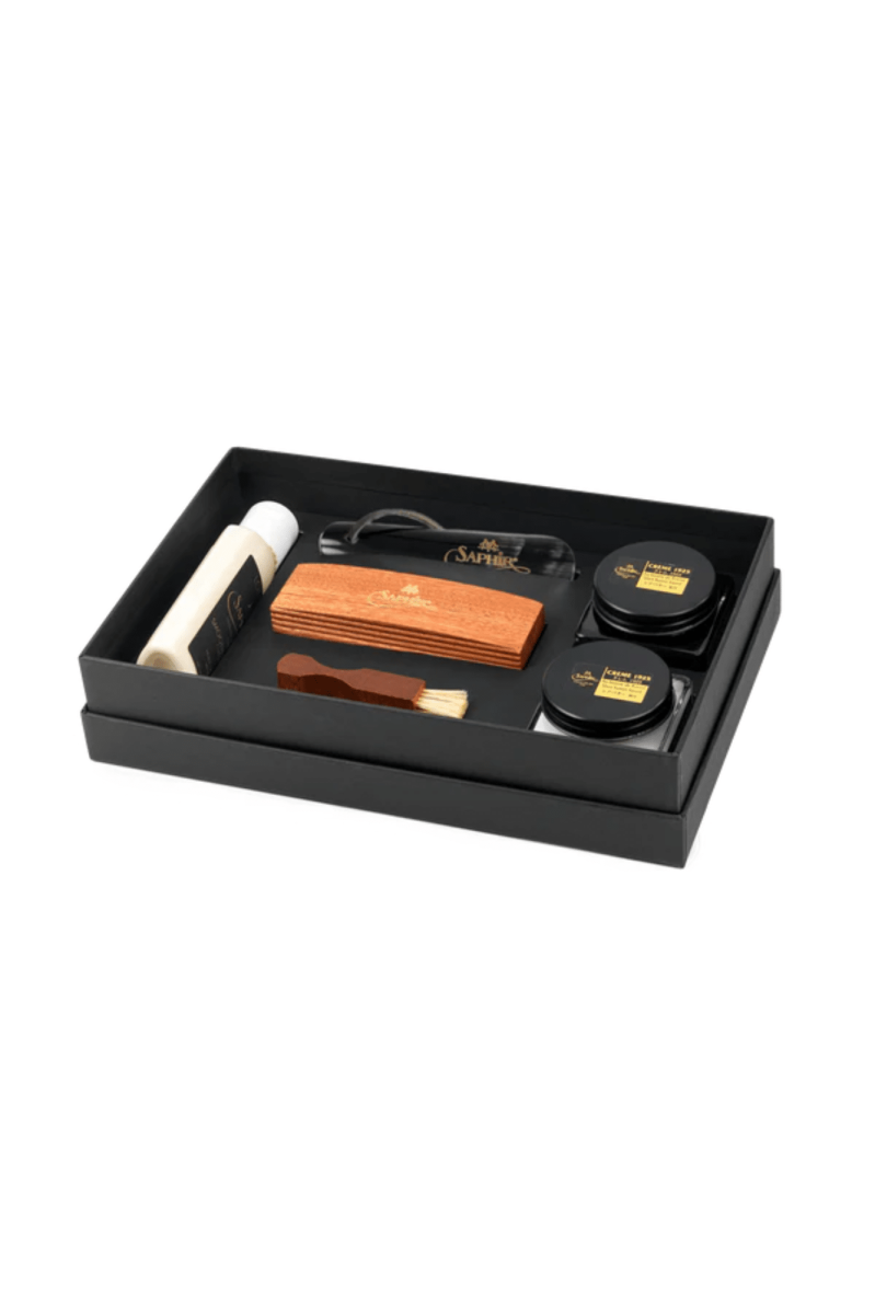 The Saphir Medaille d’Or Esthete Kit is the ultimate collection for those who demand the finest in leather care. This luxurious kit contains all the essentials needed to maintain and enhance your most prized shoes, ensuring a deep, lasting shine and superior nourishment. Cream 1925, black, 75 ml Cream 1925, colorless, 75 ml White polishing brush White Pommadier brush Lotion, 125 ml Shoe horn, 10 cm