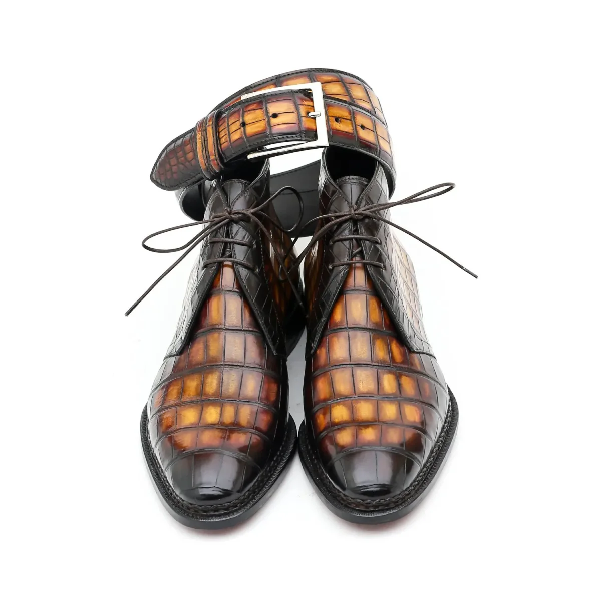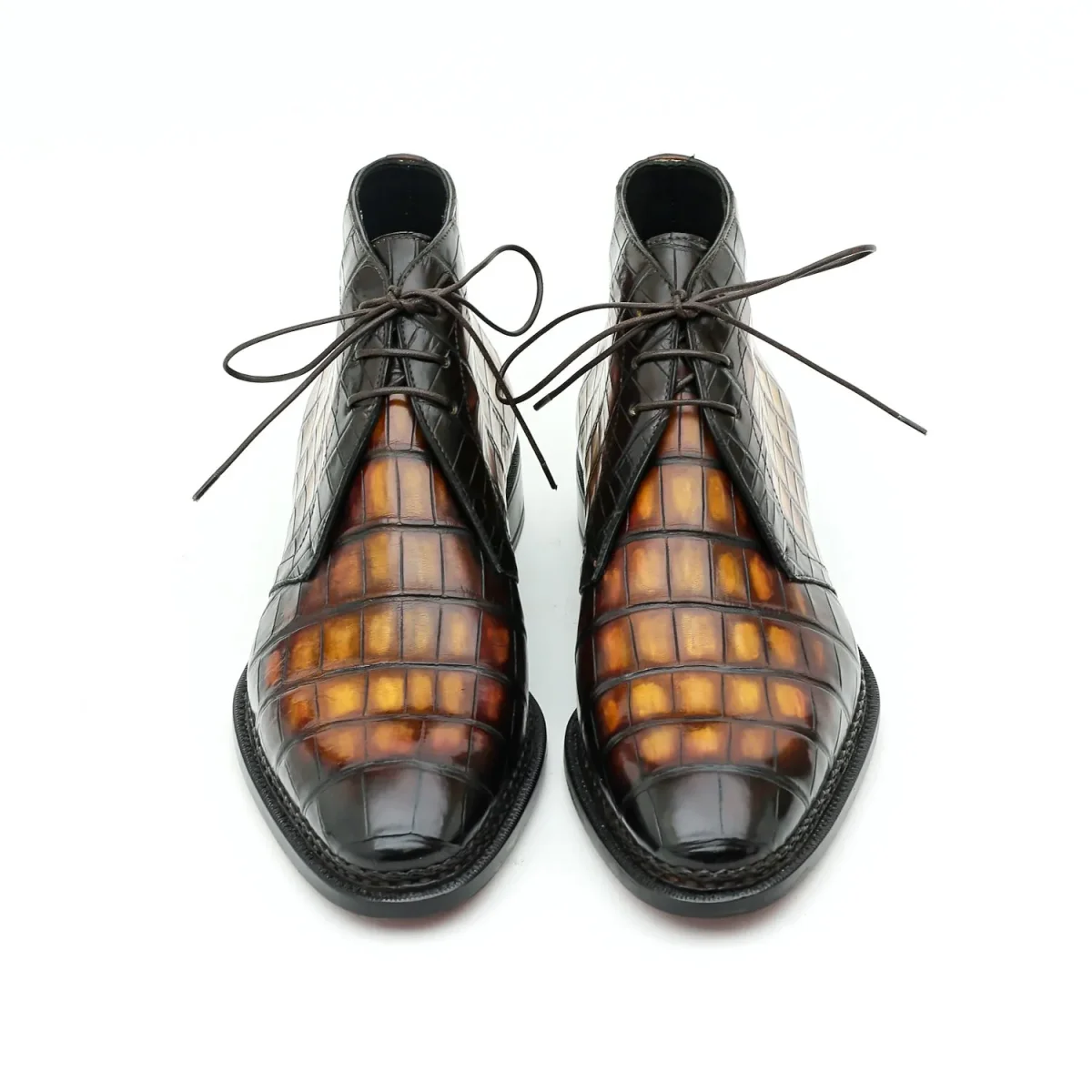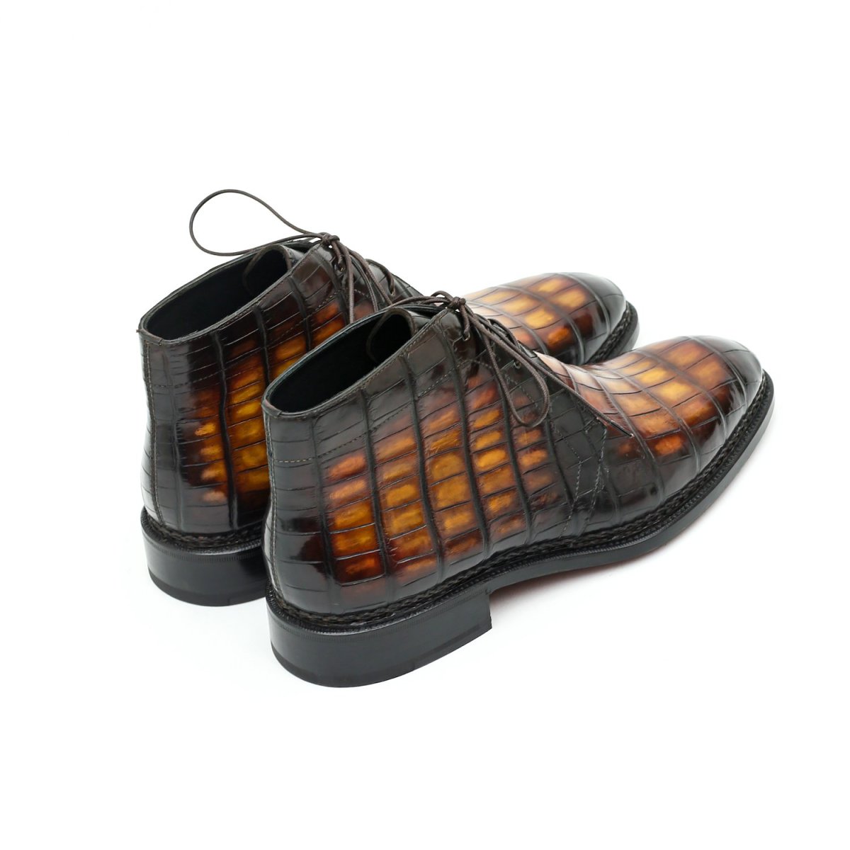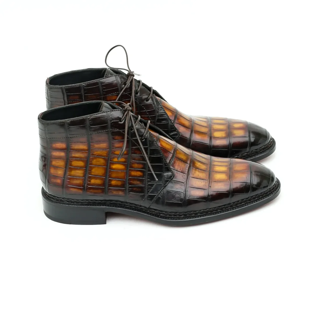 L’Ultimate Desert Boots est une bottine de type Chukka montée en véritable cousu Norvégien et réalisée ici dans sa version la plus précieuse en cuir d’Alligator patiné dans un coloris caramel, fauve bien contrasté. Une bottine d’exception pour un style très casual hyper chic.